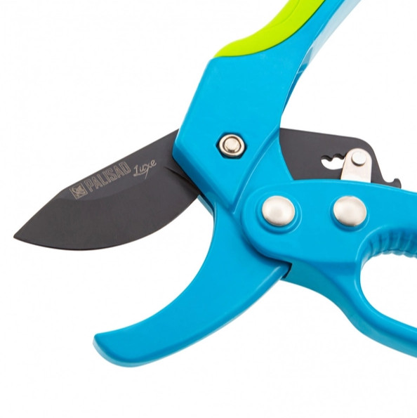 Универсальный секатор с прямым резом, двухкомпонентными рукоятками и фиксатором на нижней рукоятке. Снабжен храповым механизмом, повышающим режущую способность инструмента без увеличения прилагаемого усилия. Защитная дуга предохраняет пальцы от уколов шипов, колючек и мелких веток. Предназначен для выполнения работ по уходу за садом. Рекомендуется для обрезки живых веток диаметром до 20 мм. Зубчики на нижнем лезвии удерживают ветку во время работы. Режущее лезвие изготовлено из инструментальной стали У8, остро заточено с двух сторон и имеет тефлоновое покрытие для защиты от коррозии. Рекомендации по применению: для среза толстой ветки достаточно несколько раз сжать и отпустить рукоятки секатора, не прикладывая большого усилия.
