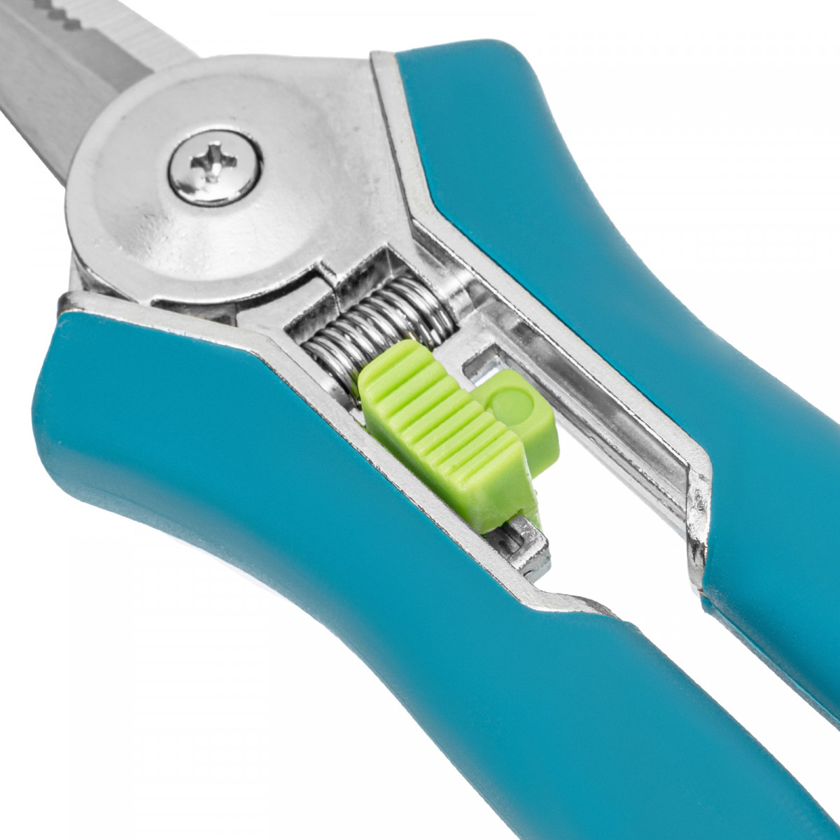 Цветочный секатор Palisad LUXE 60500 длиной 150 мм, с металлическими обрезиненными рукоятками, предназначен для срезания молодых побегов и стеблей диаметром до 10 мм. Также используется для оформления крон бонсай и топиариев, полезен в быту — секатором можно резать бумагу, картон, ткань, подвязочный материал. Крепежный винт позволяет регулировать плотность примыкания лезвий. Инструмент пригодится для ухода за цветами и другими растениями на дачном участке.