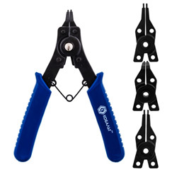 Съемник стопорных колец универсальный с 4-мя насадками КОБАЛЬТ 246-463, предназначен для снятия и установки внутренних и внешних стопорных колец с валов и шпилек при сборке-разборке различных механизмов узлов и агрегатов. Изготовлен из углеродистой инструментальной стали. Удобные, изолированные полимерными чехлами рукоятки повышают комфортность работы. Рекомендован для колец диаметрами от 12мм до 60мм. Длина общая 150 мм, минимальное расстояние между носиками 2,2мм, диаметр носика 1,6мм. В комплекте 4 съемные насадки: прямая и изогнутая для внешних колец и прямая и изогнутая для внутренних колец