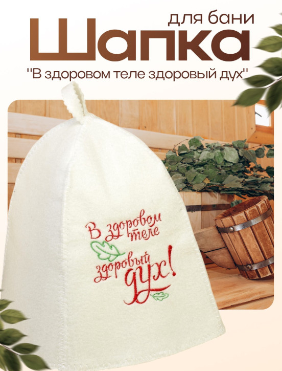 Шапка для бани и сауны с вышивкой В здоровом теле здоровый дух полиэфир 70% шерсть 30% Добропаровъ