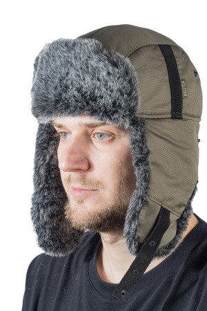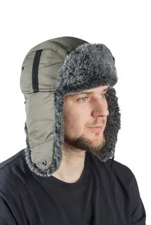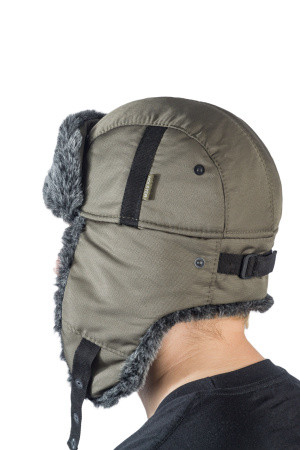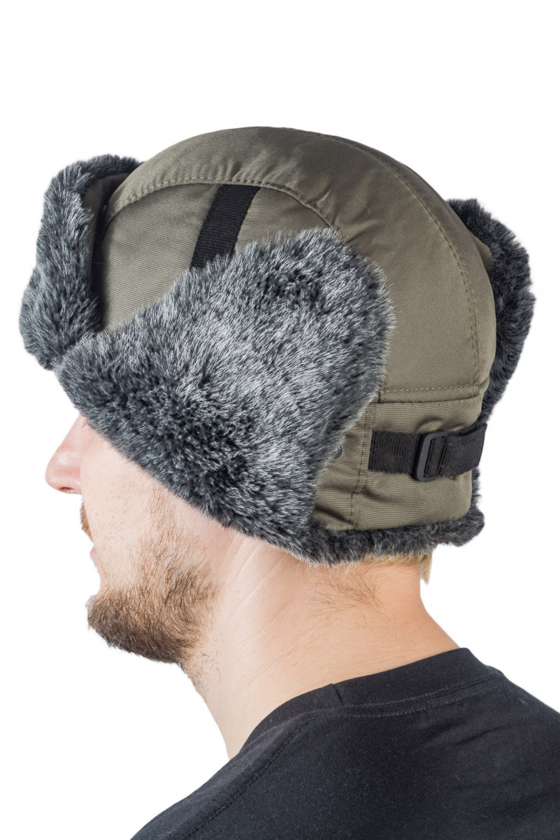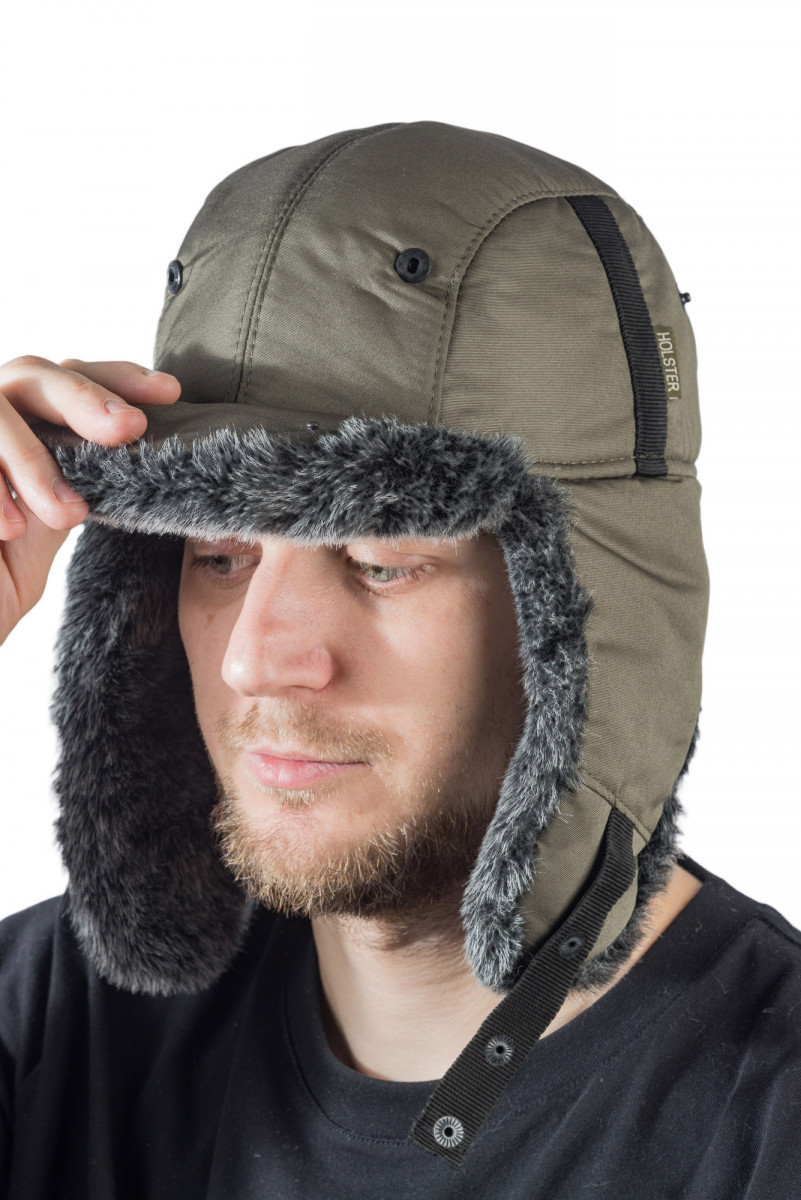 Зимняя ушанка Holster в оливковом цвете с меховой опушкой - стильный и практичный выбор для любителей рыбалки и охоты в холодное время года.