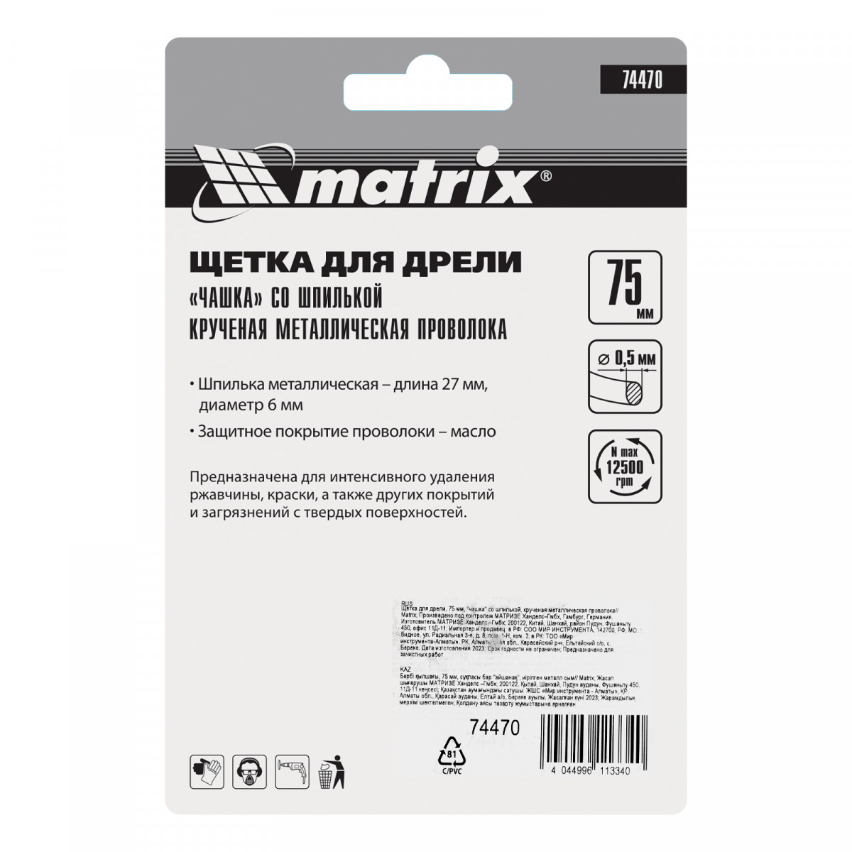Щетка для дрели «чашка» Matrix 74470 диаметром 75 мм, со шпилькой и щетиной из крученой металлической проволоки, — оснастка для электродрелей с патроном под хвостовик диаметром 6 мм. Рекомендуемая скорость вращения 12500 об/мин. Насадку используют для зачистки сварных швов и черновой обработки металлических, деревянных, бетонных поверхностей. Щетка эффективно удаляет толстый слой загрязнений, ржавчины, ЛКМ. Благодаря форме «чашка» насадка оптимальна для обработки значительных по площади поверхностей. Ее применяют в строительстве, машиностроении, а также в быту. Во время работы необходимо использовать средства индивидуальной защиты.