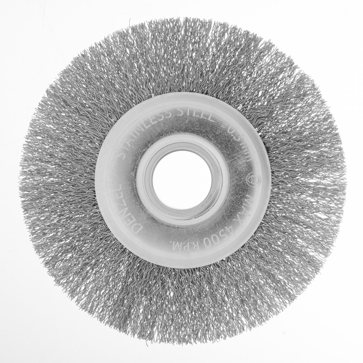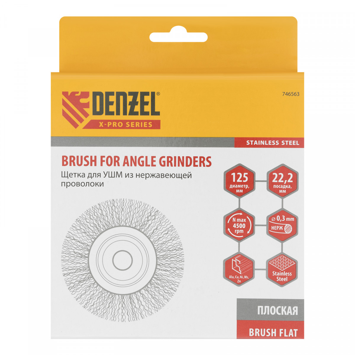 Щетка для УШМ, 125 мм, "Плоская", витая нержавеющая проволока 0.3 мм, посадка 22.2 мм Denzel