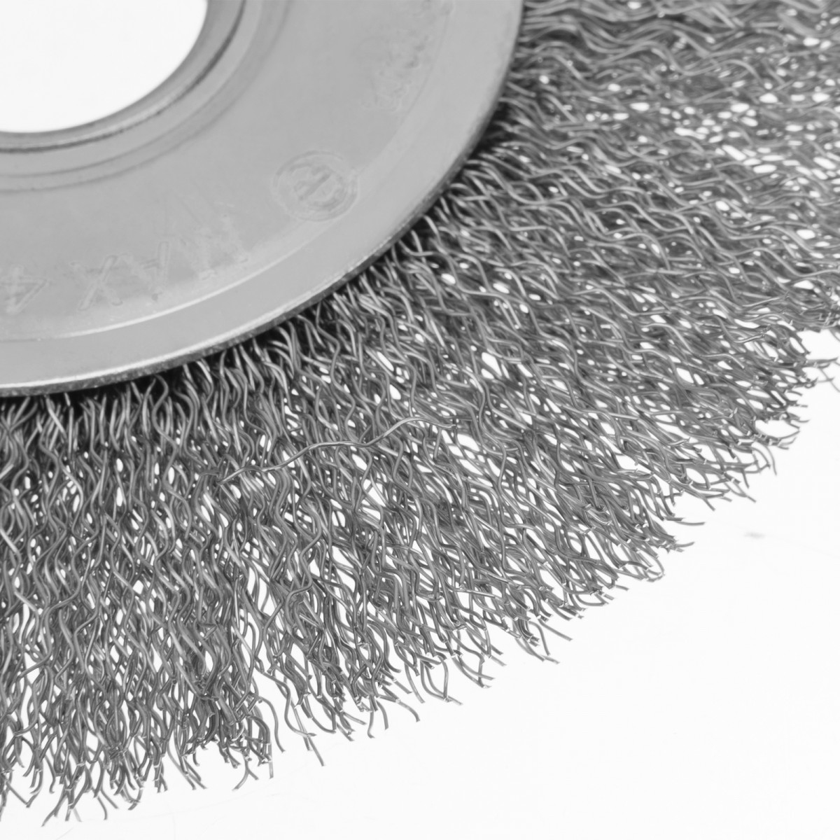 Плоская щетка для УШМ Denzel 746563 диаметром 125 мм, с щетиной из витой нержавеющей проволоки 0,3 мм, с посадкой 22,2 мм, постепенно снимает тонкий слой материала, поэтому ее используют для щадящей обработки металлических, деревянных, пластиковых поверхностей, а также изделий из нержавеющей стали. Щетка удаляет ржавчину, загрязнения, остатки лакокрасочных покрытий из труднодоступных мест, пазов и углов. Оснастка с посадкой 22,2 мм устанавливается на фланец углошлифовальной машины, что удобно для длительной работы без смены насадок. Рекомендуемая максимальная скорость вращения составляет 4500 об/мин. Во время работы следует использовать средства индивидуальной защиты. Щетку применяют в строительстве, машиностроении, а также в быту.
