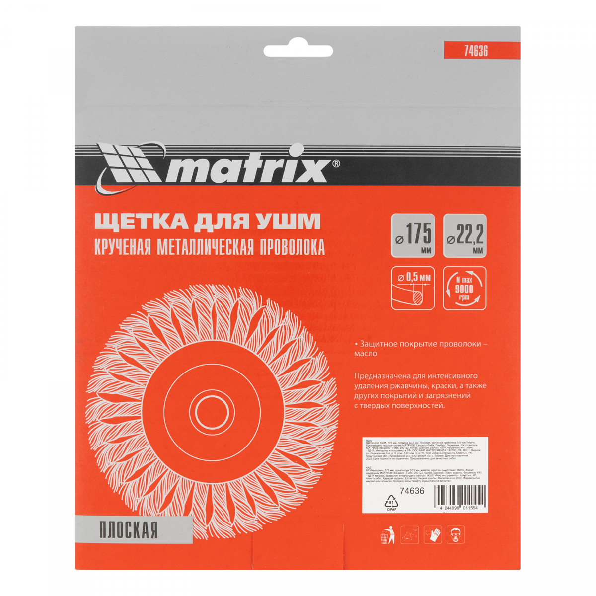 Плоская щетка Matrix 74636 диаметром 175 мм и посадкой 22,2 мм, с щетиной из крученой проволоки толщиной 0,5 мм, устанавливается на вал УШМ, поддерживающей скорость вращения не более 9000 об/мин. Эффективно удаляет загрязнения, толстый слой ржавчины и лакокрасочных материалов с поверхностей, поэтому используется для проведения грубой (черновой) обработки. Плоской щеткой удобно очищать труднодоступные места, в том числе углы и изгибы.
