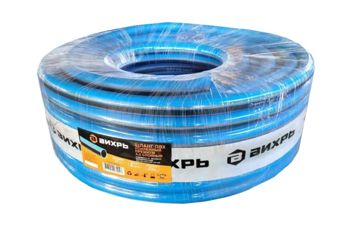 Армированный усиленный поливочный шланг Вихрь премиум, ПВХ, пищевой, четырехслойный, 3/4", 25 м, синий 73/7/2/11 применяется для полива сада или дачного участка.