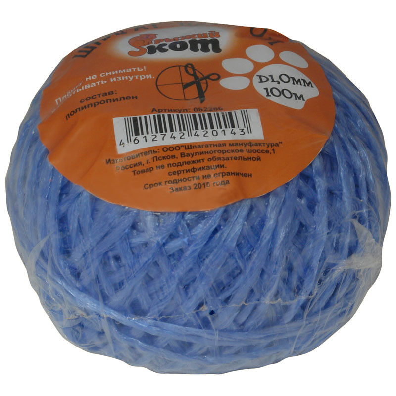 Состав цветной полипропилен 100 %, длинна вклубке 100 метров, применяеется для подвязки сельскохозяйственных культур, для упаковки различных товаров, мелких и среднегабаритных грузов, для упаковки печатной продукции. Шпагат сохраняет прочность в течении большого периода времени, не боится сырости. Разматывается изнутри.