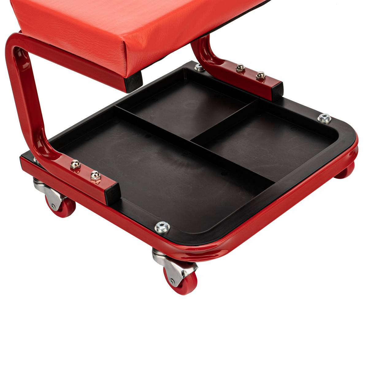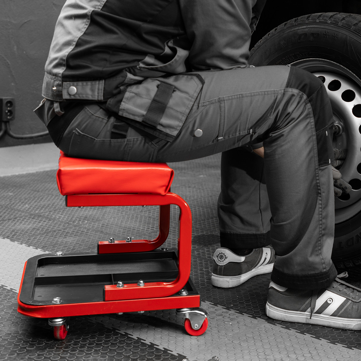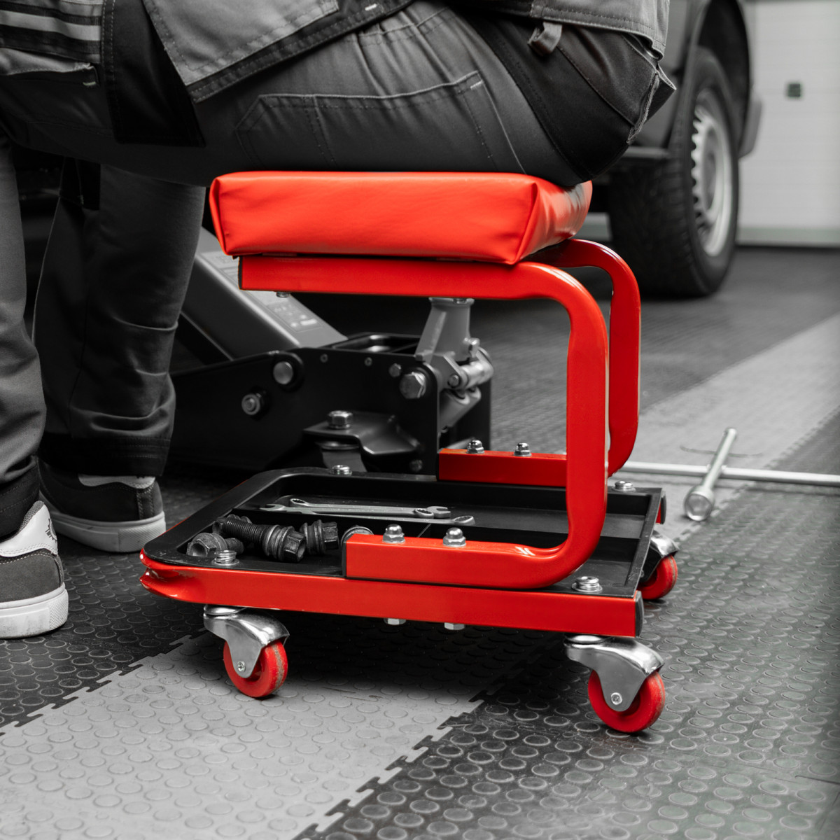 • На сиденье предусмотрены 4 колеса с углом поворота на 360°, поэтому можно с удобством перемещаться по гаражу.