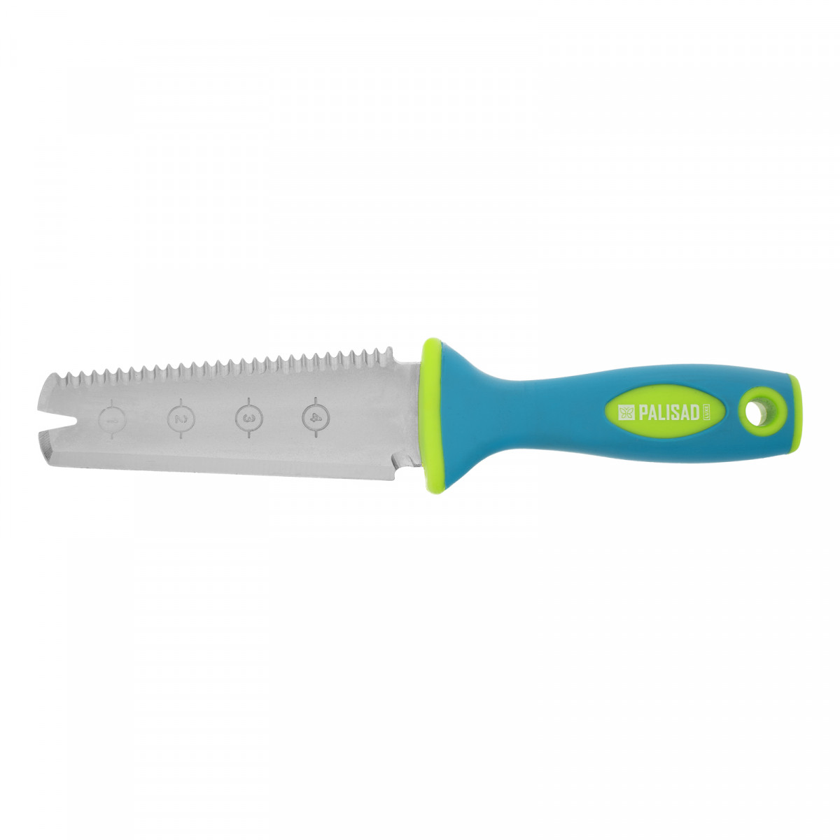 Посадочный совок Palisad LUXE 62070 размером 60 x 285 мм представляет собой многофункциональный инструмент 5 в 1, позволяющий решать различные задачи во время работы в саду и огороде: высаживать и пересаживать растения, обрезать корни, шпагаты и ленты, удалять сорняки. Компактный инструмент с полотном размером 50 x 125 мм удобен для работы на небольших грядках и клумбах.