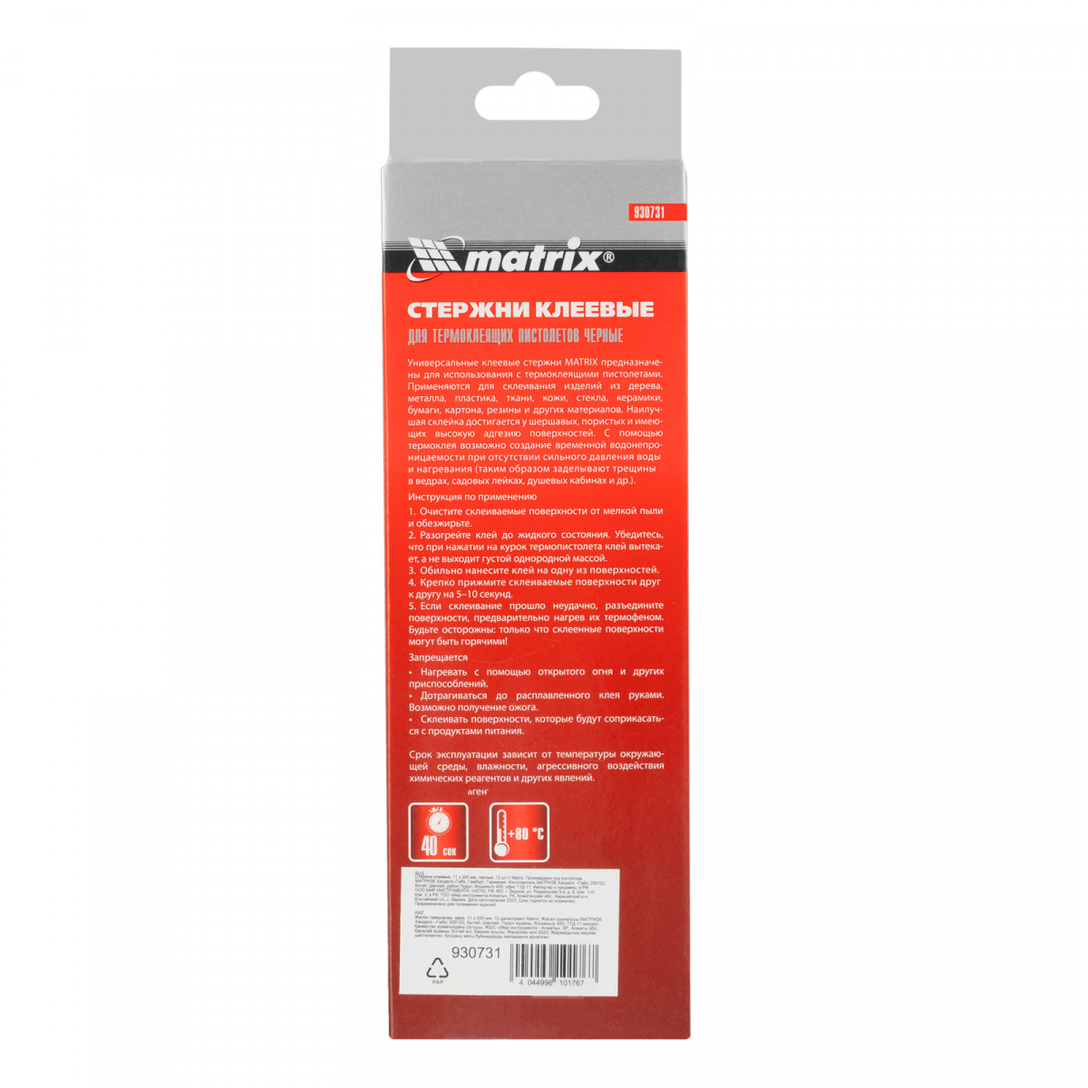 Черные клеевые стержни Matrix 930731 длиной 200 мм, 12 шт. в упаковке, — расходные материалы для клеевых пистолетов калибра 11 мм. Обеспечивают надежное сцепление различных материалов: бумаги, пластика, древесины, керамики, электрических плат и т.д. Подходят также для герметизации швов и трещин.