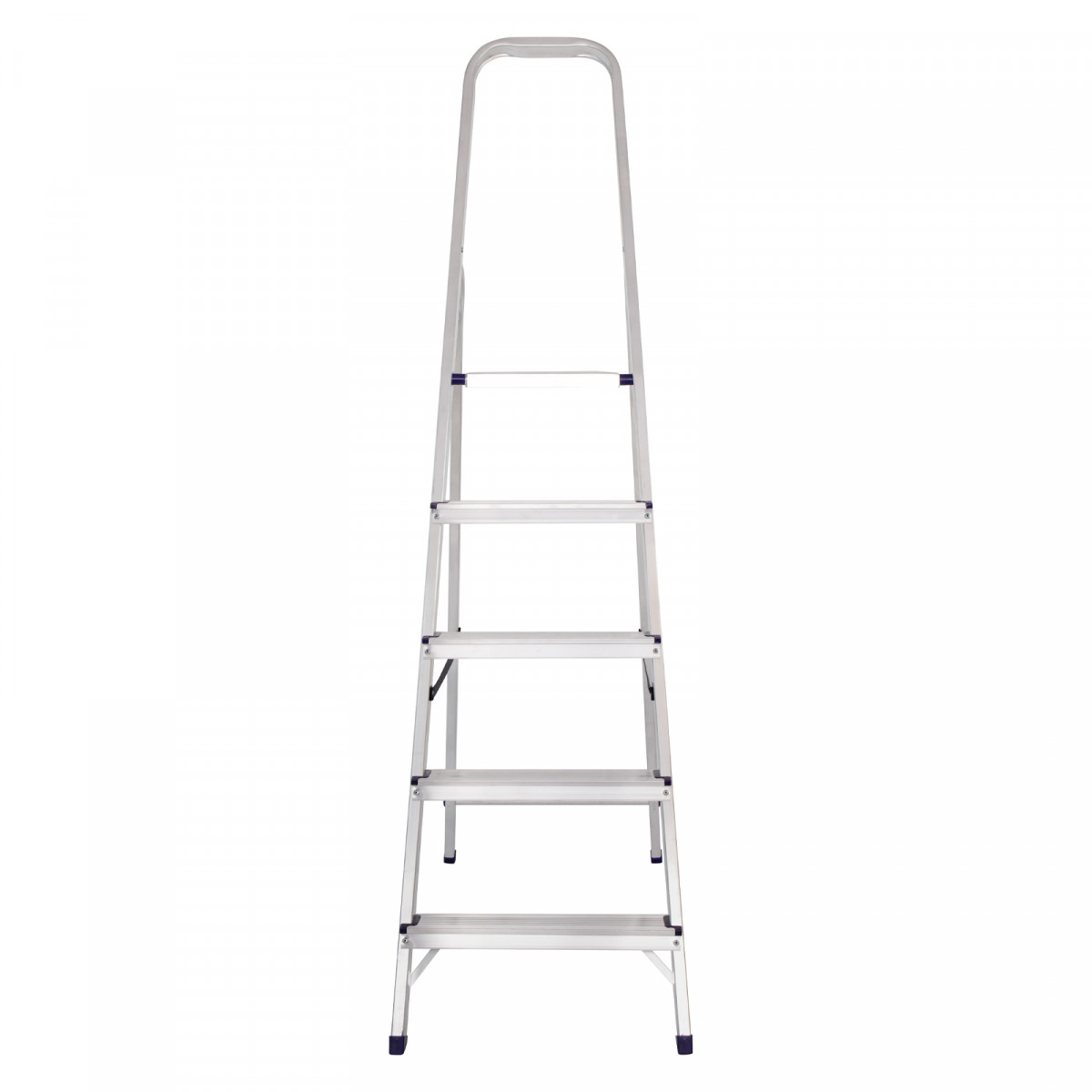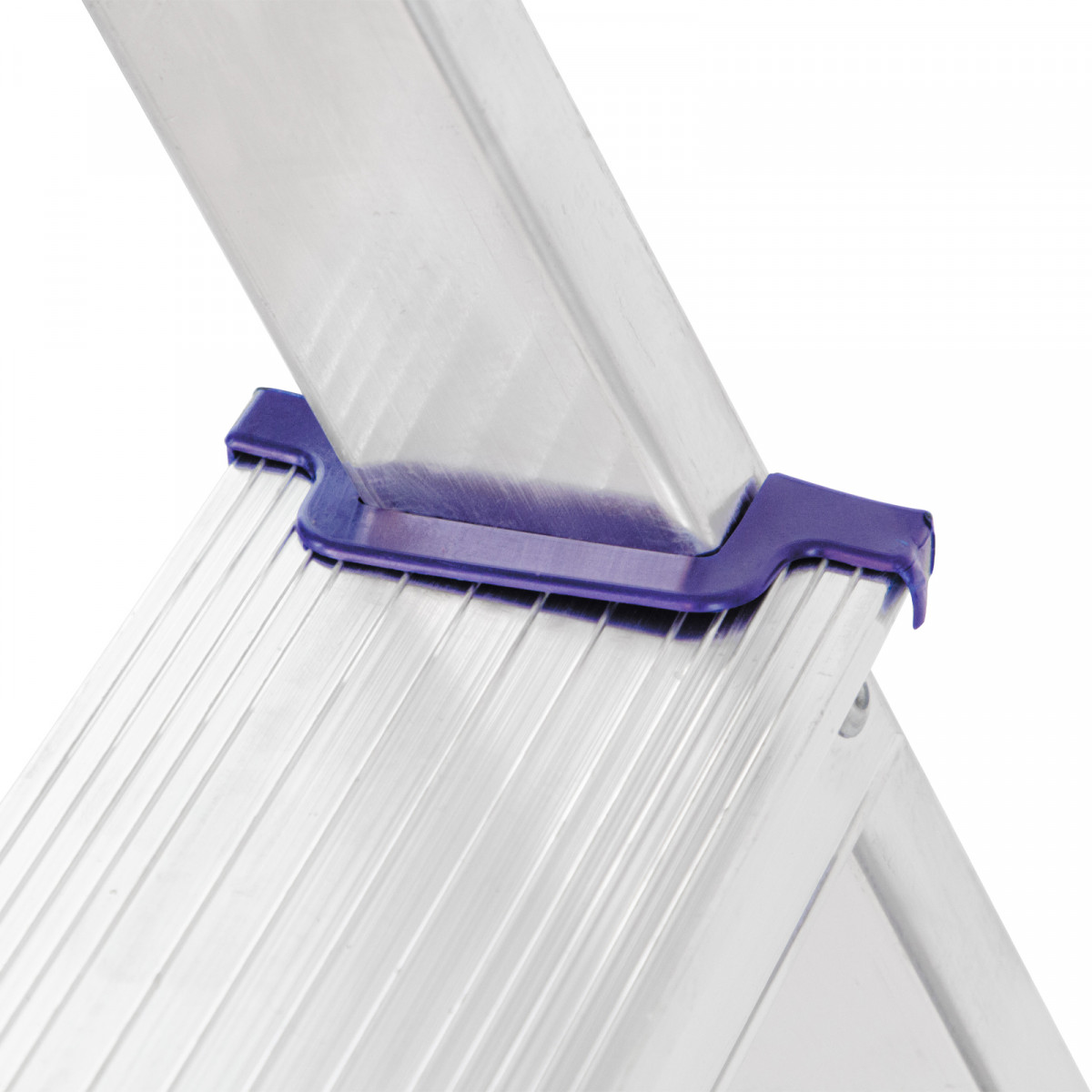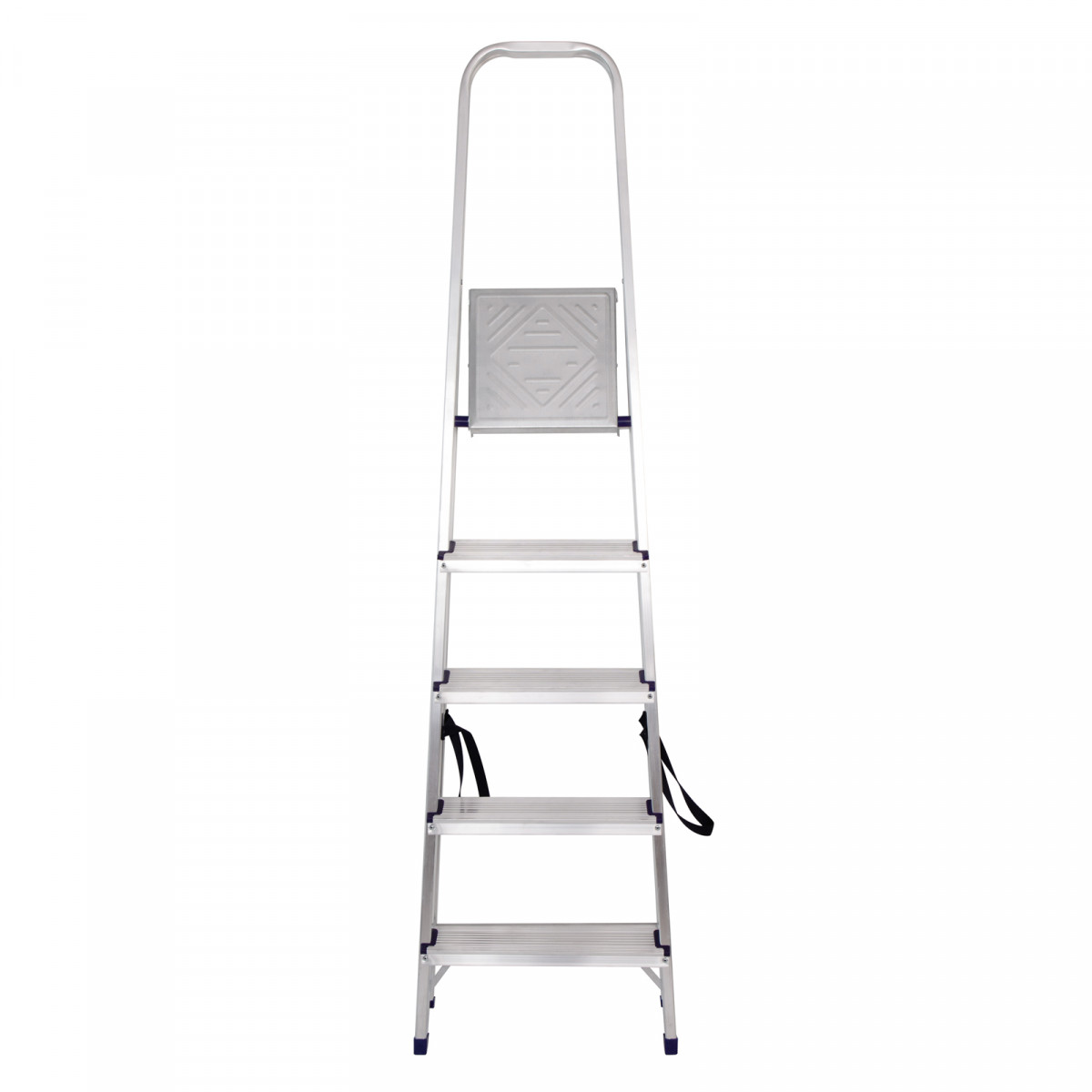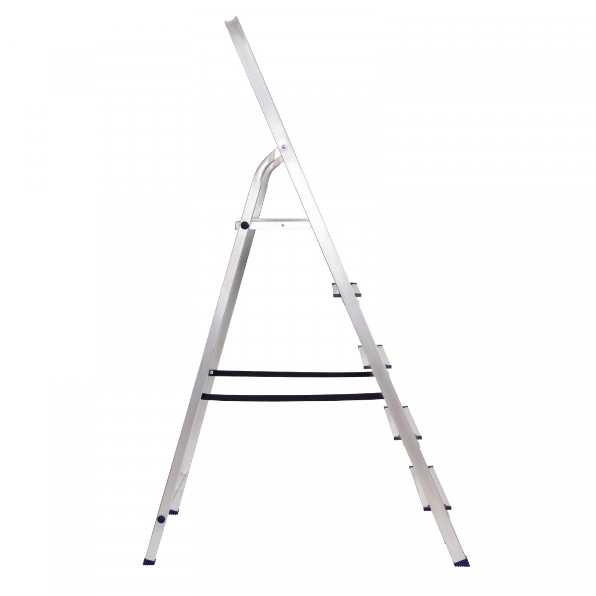 • Надежность — рама из прямоугольного алюминиевого профиля выдерживает нагрузку до 150 кг, широкие ступени закреплены заклепками, страховочные стяжки повышают прочность конструкции.