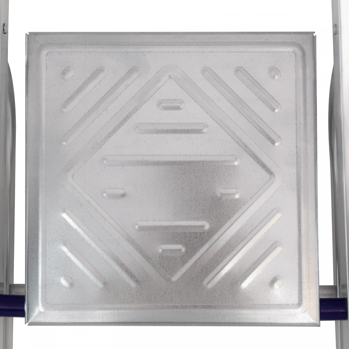 • Продуманная конструкция — стальная рабочая площадка с зацепами надежно фиксирует стремянку в разложенном положении.