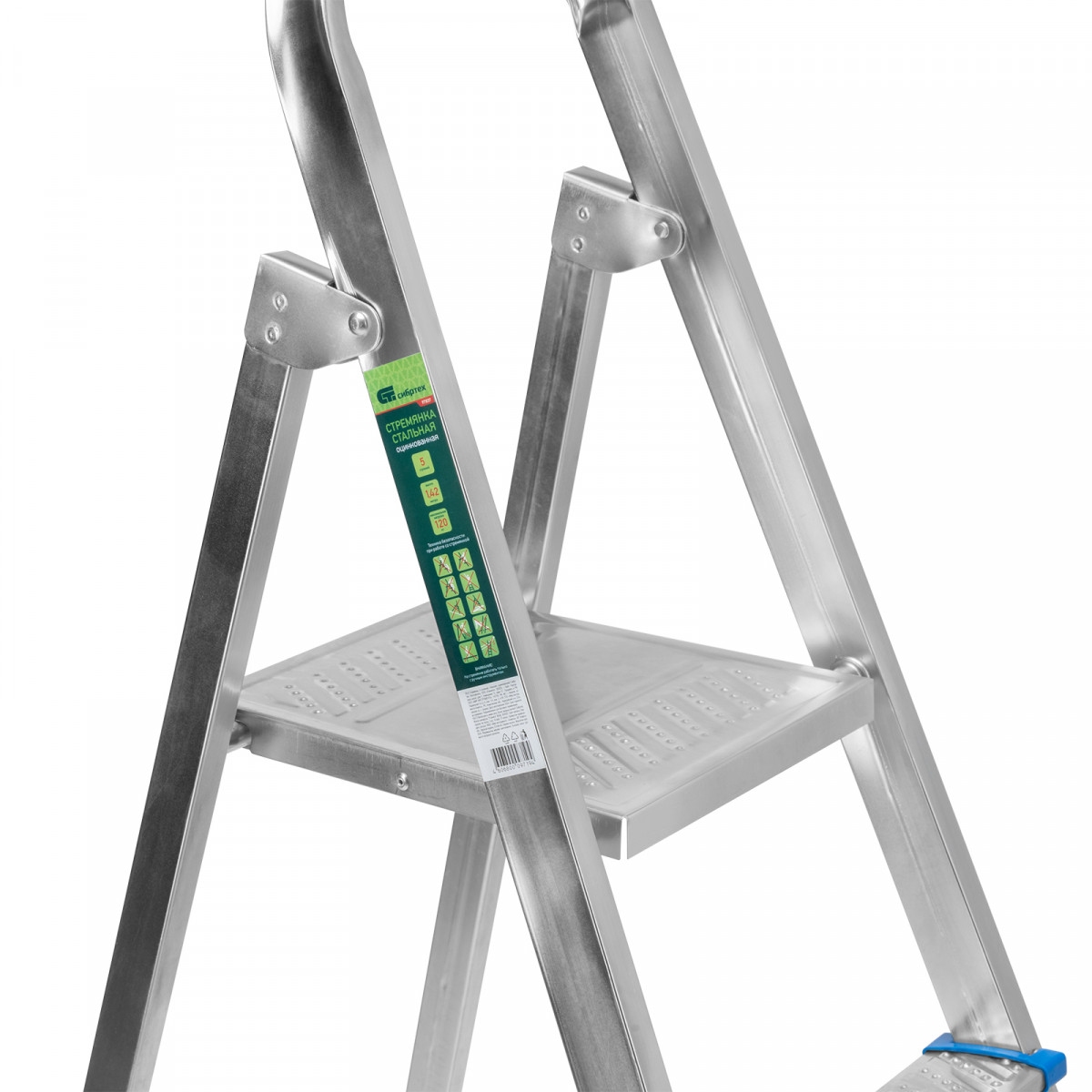 Стремянка Сибртех обеспечивает безопасность пользователя благодаря рифленым ступеням и защитным накладкам на углах.