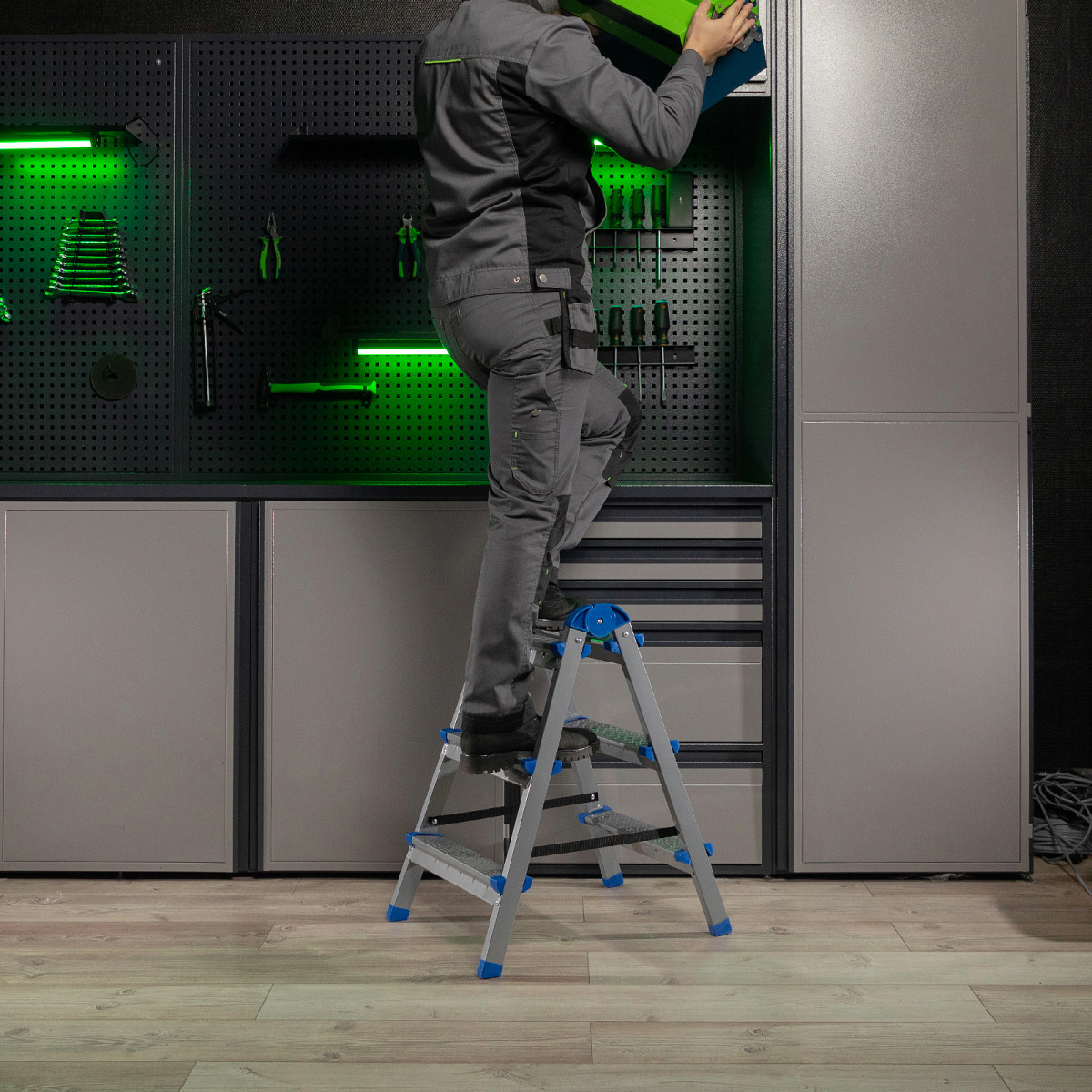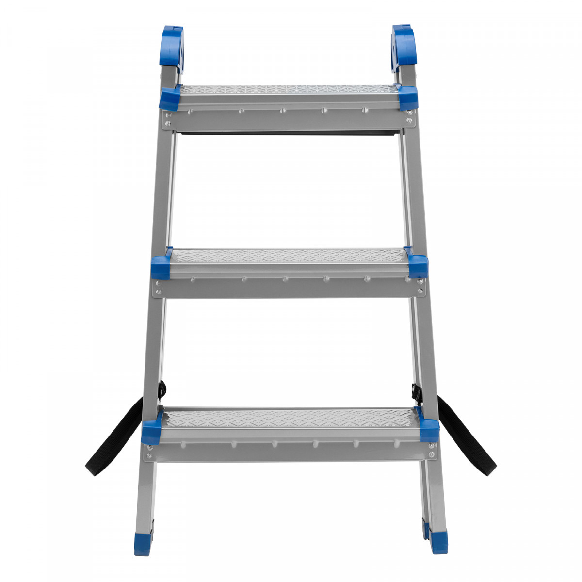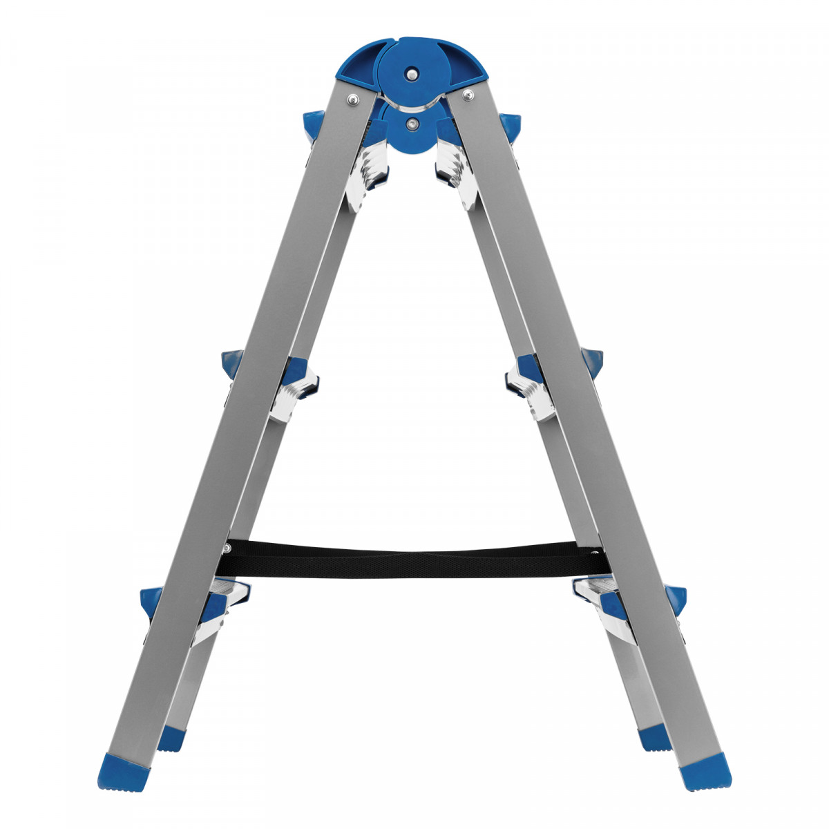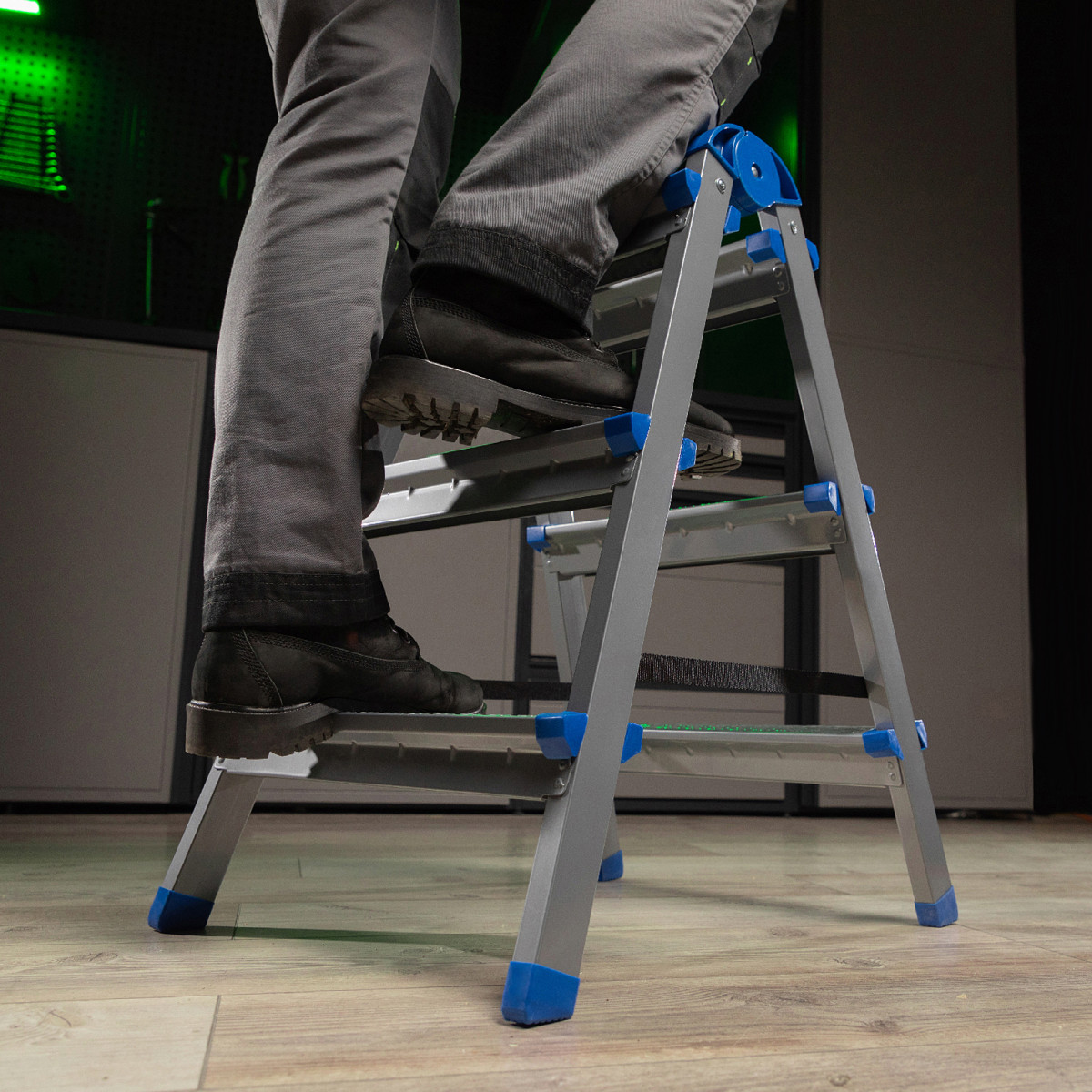 Стремянка двухсторонняя Сибртех 97983 со стальным профилем и 3 стальными ступенями помогает решать бытовые задачи на высоте, превышающей человеческий рост. Ее используют, чтобы доставать предметы с антресолей или шкафов, проводить уборку, менять лампочки, вешать полки или картины. Работать с электроинструментом на ней не рекомендуется. Стремянка с пластиковым складным механизмом повышенной стабильности и широким основанием очень устойчива на ровной поверхности. Площадка находится на высоте 66 см от опорной поверхности, рабочая высота стремянки составляет 266 см (при среднем росте пользователя 170 см).