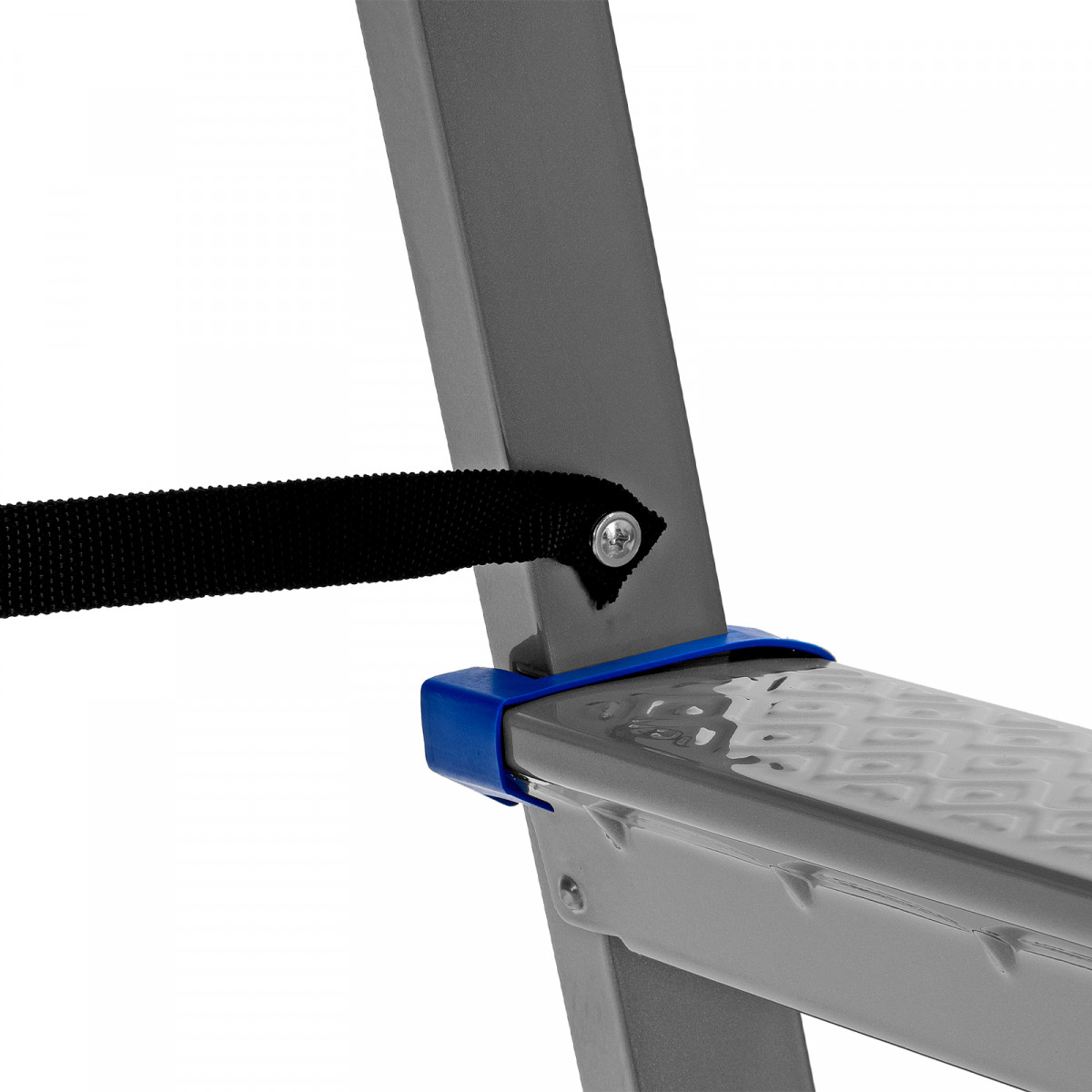 - Надежность — стремянка из стального профиля с широкими ступенями выдерживает вес до 120 кг, страховочные ленты из полиэстера повышают устойчивость.
