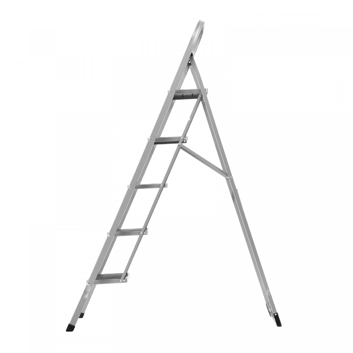 - Прочная конструкция — стремянка изготовлена из стального профиля и снабжена надежным механизмом раскладывания, поэтому выдерживает нагрузку до 150 кг.