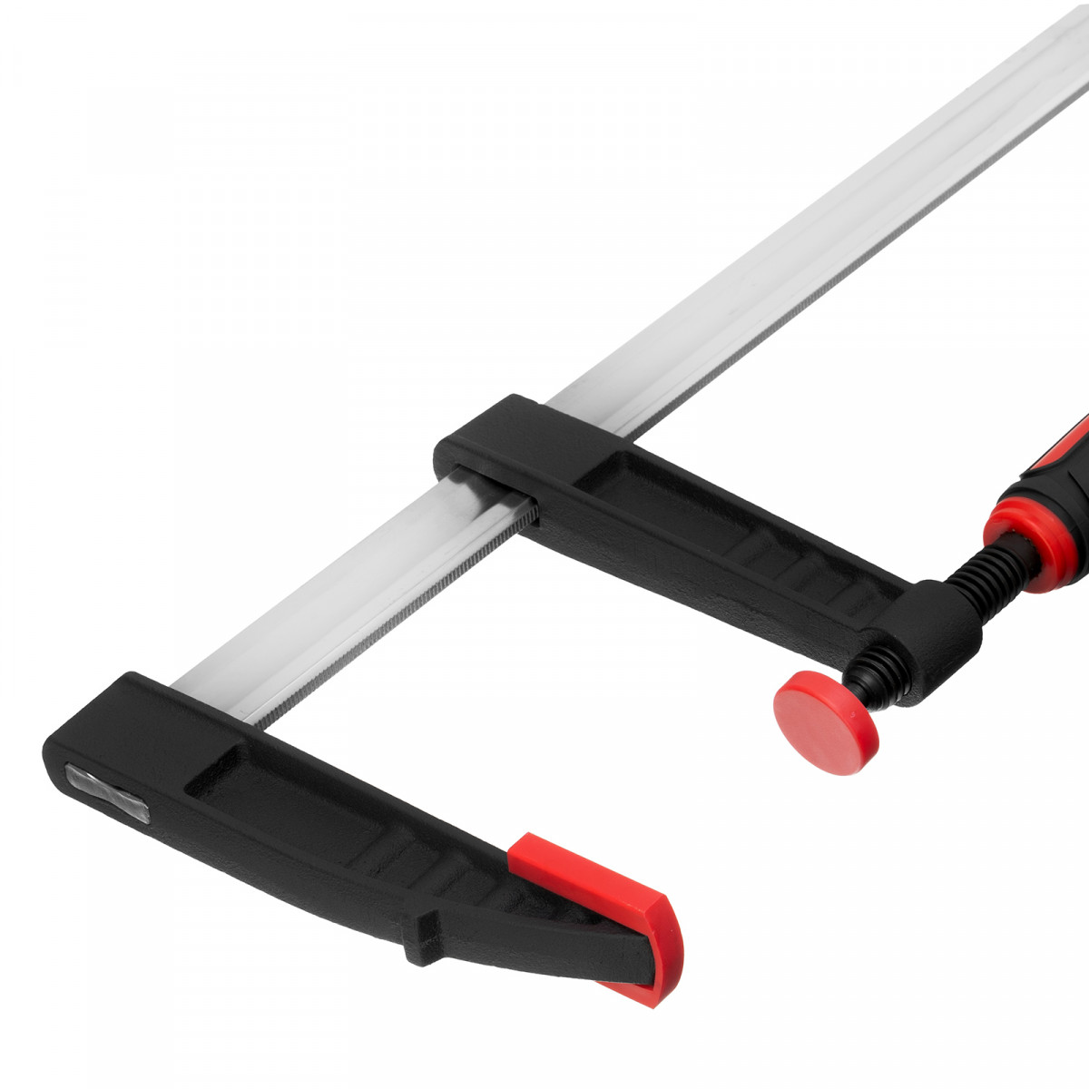 Усиленная F-образная струбцина Matrix 20411 размером 400 х 80 х 500 мм используется для зажима металлических, деревянных и других заготовок для их последующей обработки или сборки. Представляет собой штангу, на которой установлены 2 кронштейна — неподвижный и подвижный. Деталь помещается между ними и прижимается к губкам при помощи винтового зажима с трапециевидной резьбой. Величина захвата регулируется при помощи подвижного кронштейна и может достигать 400 мм. Струбцину используют для проведения слесарных и столярных работ. Металлическая конструкция выдерживает высокую температуру, поэтому инструмент пригодится для выполнения сварочных работ (перед началом необходимо снять пластиковые накладки с губок).