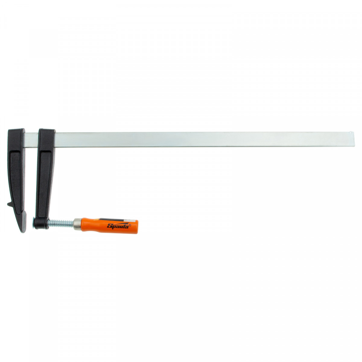 F-образная струбцина Sparta 204415, 500 х 120 х 570 мм, используется в столярном и слесарном деле и позволяет фиксировать заготовки из металла, древесины и других материалов для их соединения или обработки. Деталь помещают между губками, одна из которых подвижна и служит для регулировки величины захвата. Винтовой зажим позволяет прикладывать значительное усилие для надежной фиксации. Защитные накладки предотвращают повреждение детали. Элементы конструкции выдерживают высокую температуру, поэтому струбцина подходит для проведения сварочных работ, при этом пластиковые накладки необходимо снять.