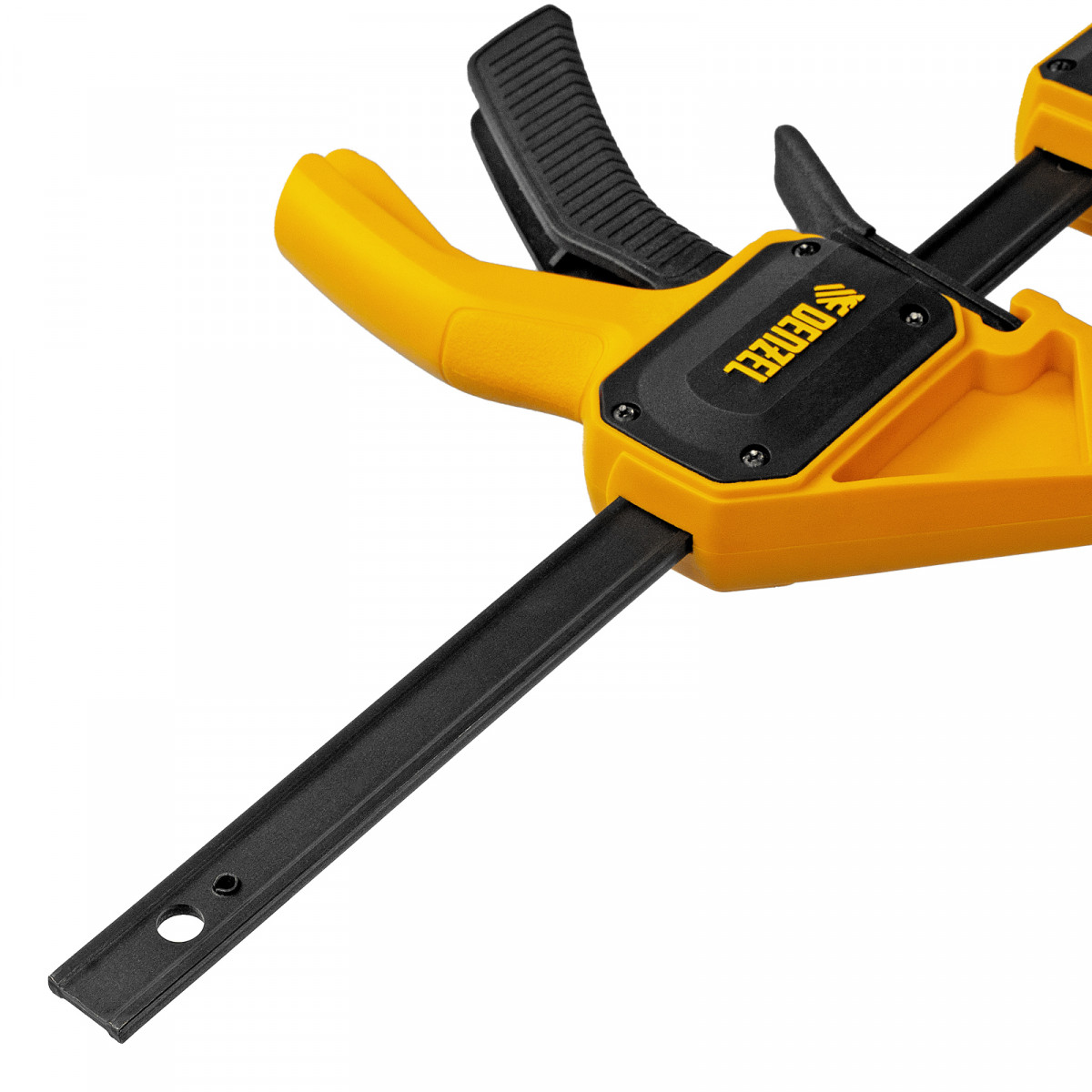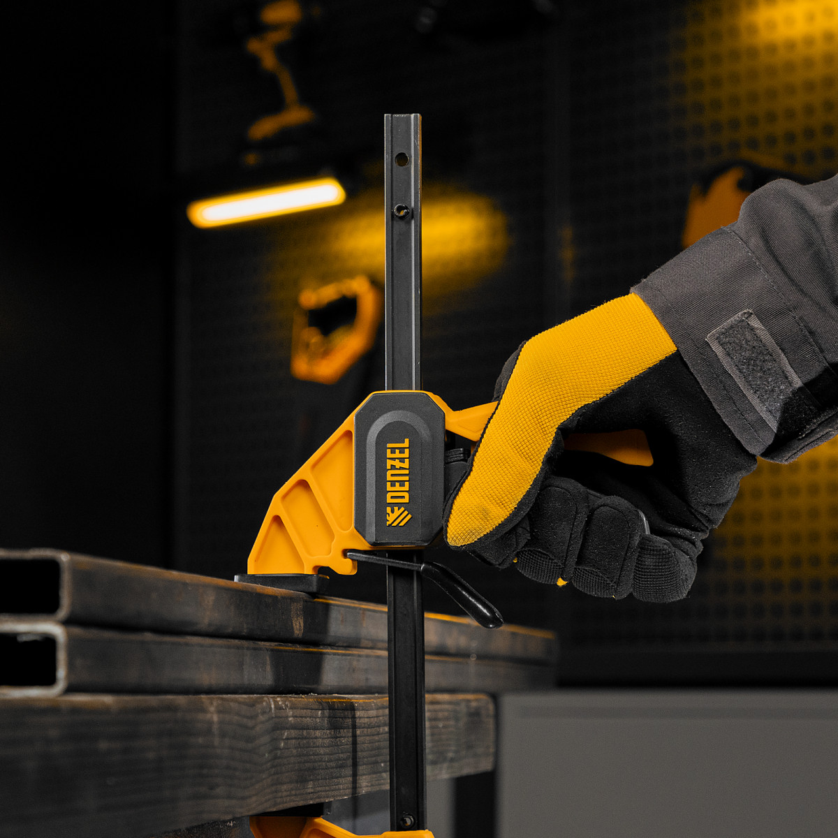 - Комфортное использование — струбцина весит всего 290 г, обрезиненная кнопка фиксации обеспечивает удобный захват.