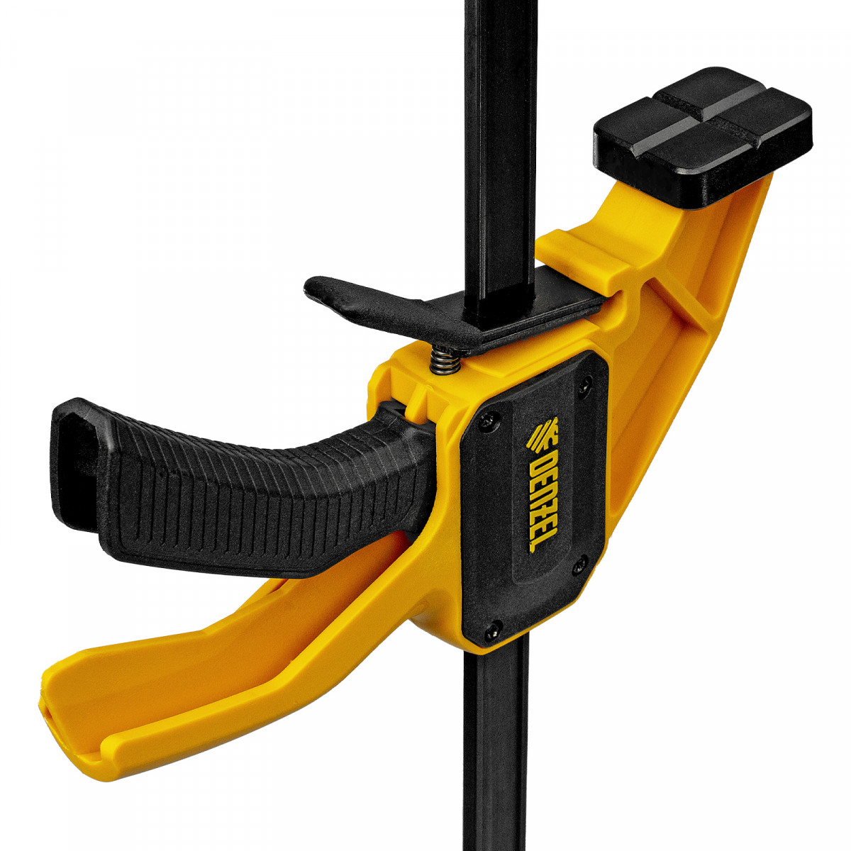 - Комфортное использование — струбцина весит всего 360 г, обрезиненная кнопка фиксации обеспечивает удобный захват.