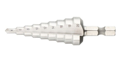 Сверло ступенчатое по металлу 4-6-8-10-12-14-16-18-20мм, P6M5, шестигранный хвостовик - предназначено для сверления отверстий разных диаметров в материалах из стали, цветных металлов, листовой стали, нержавейки и пластика.  Основным преимуществом ступенчатого сверла является сверление без предварительной подготовки заготовки (накернивания, засверловки), а также отсутствием заусенцев на поверхности заготовки после сверления.  Изготовлено сверло из высококачественной стали Р6М5, имеет твёрдость 62 – 64 HRC.  Ступенчатым сверлом предусмотрено сверление отверстий диаметром от 4 до 20 мм.  Шестигранный хвостовик предотвращает проскальзывание сверла в патроне и подходит практически ко всем типам дрелей, шуруповертов и быстросъемных адаптеров.