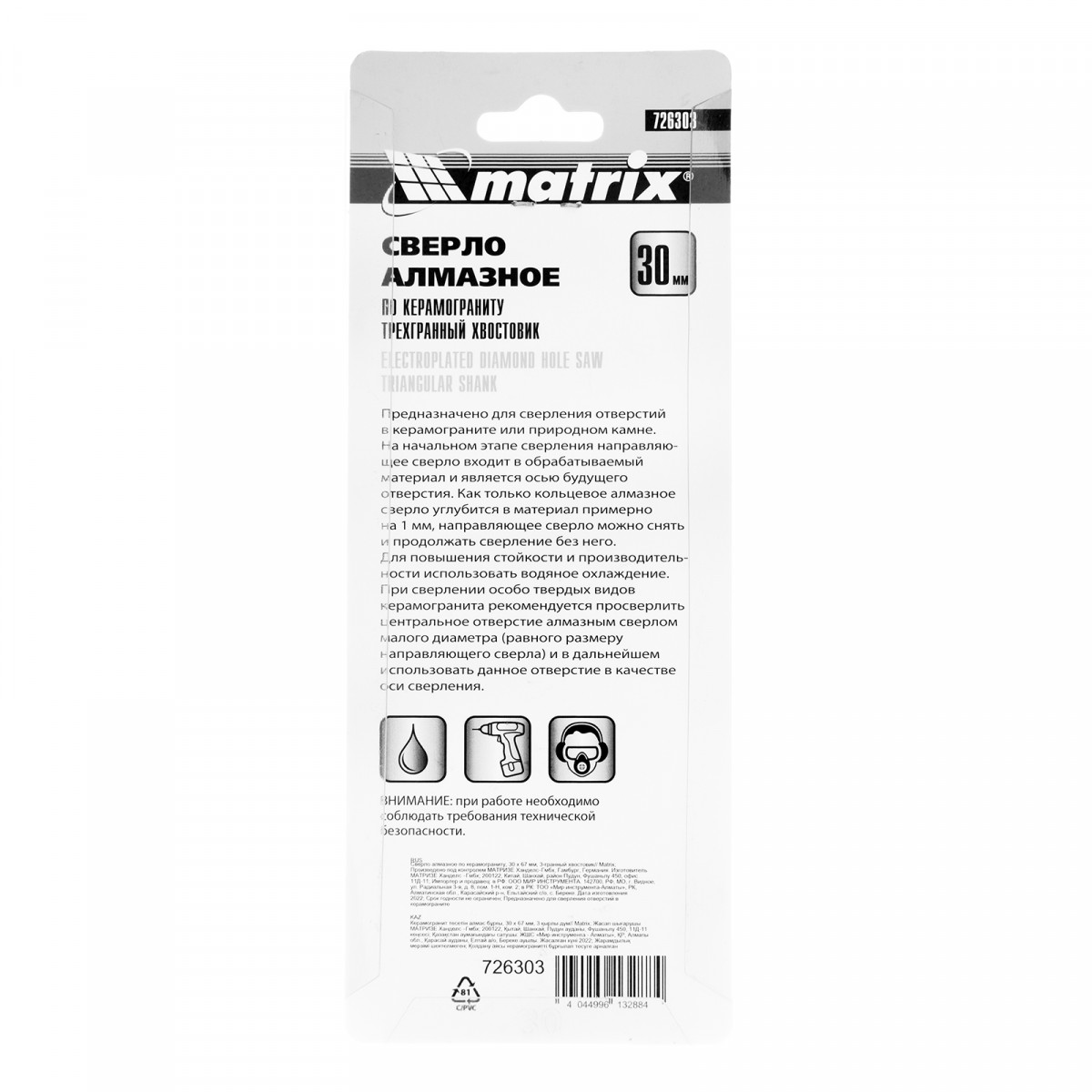 Универсальное алмазное сверло по керамограниту Matrix 726303 размером 30 х 67 мм, с 3-гранным хвостовиком, применяется для получения отверстий в стекле, плитке, кафеле. За счет высокой концентрации алмазов в режущем слое оно легко справляется со сверлением керамогранита. Сверло рассчитано на профессиональное использование с дрелями и шуруповертами. Водяное охлаждение в процессе работы значительно повышает срок службы оснастки.