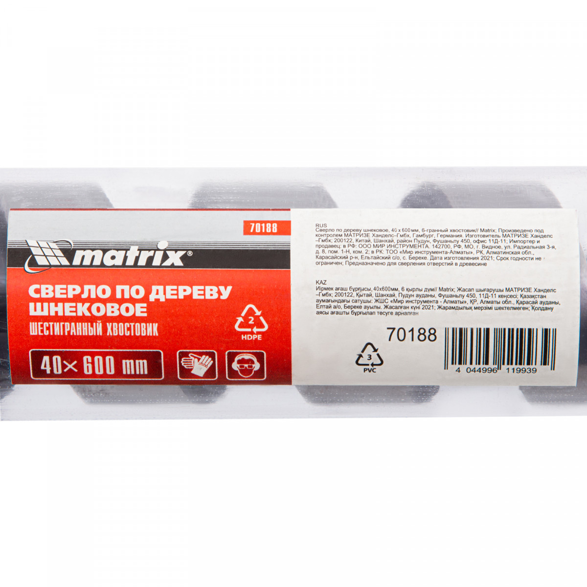 Сверло по дереву шнековое, 40 х 600 мм, шестигранный хвостовик Matrix