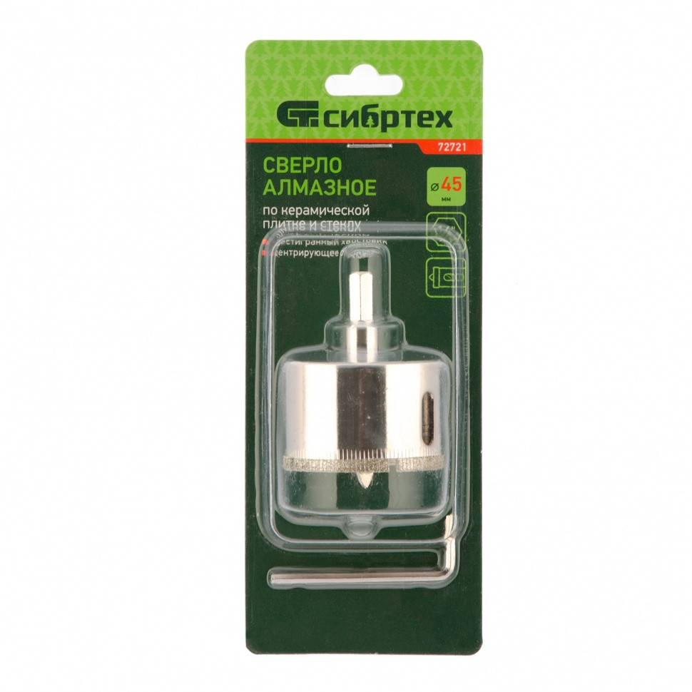 Сверло Сибртех 72721 размером 45 х 55 м, с шестигранным хвостовиком и центрирующим сверлом, позволяет получать отверстия в керамической плитке и стекле. Его устанавливают на дрель или шуруповерт, рекомендуемый диапазон рабочих оборотов 350-700 об/мин. Оснастка используется при выполнении бытовых ремонтных и отделочных работ.