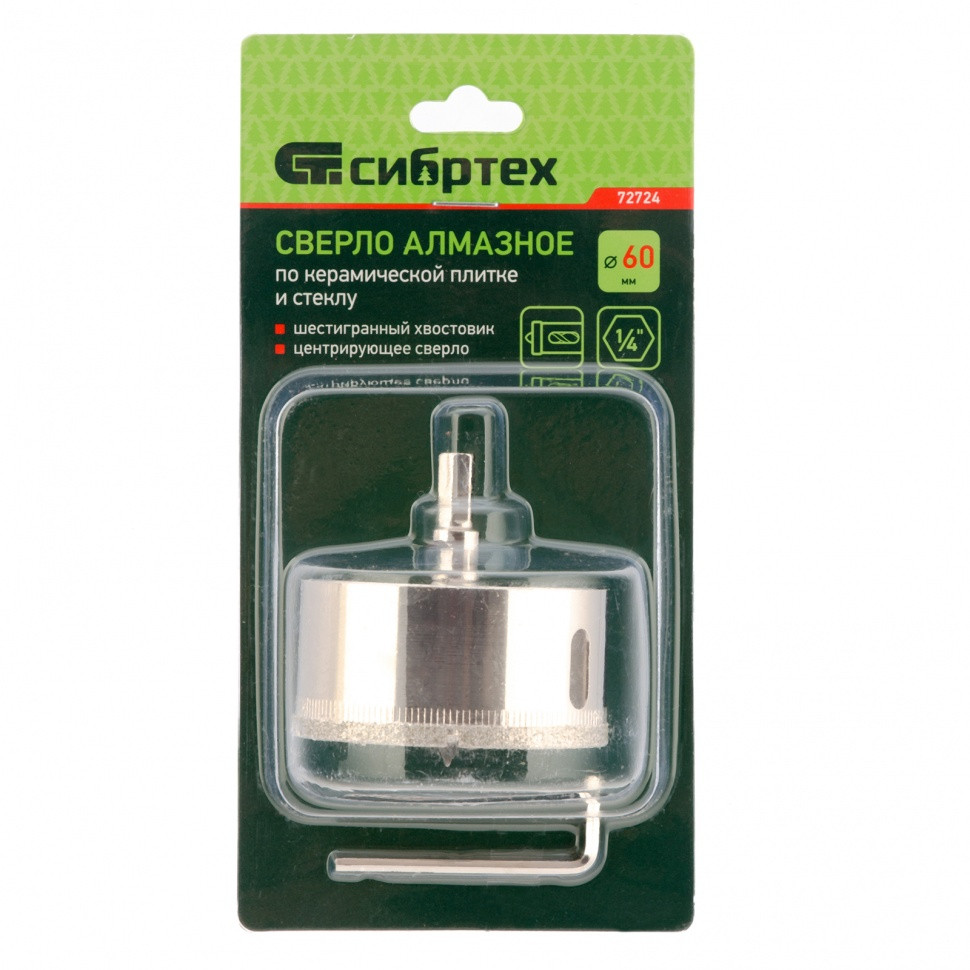 Сверло Сибртех 72724 размером 60 х 55 м, с шестигранным хвостовиком и центрирующим сверлом, позволяет получать отверстия в керамической плитке и стекле. Его устанавливают на дрель или шуруповерт, рекомендуемый диапазон рабочих оборотов 350-700 об/мин. Оснастка используется при выполнении бытовых ремонтных и отделочных работ.