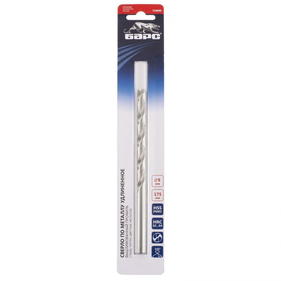 Удлиненное спиральное сверло по металлу Барс 718090 диаметром 9 мм и длиной 175 мм, из стали P6M5, имеет угол заточки 135° и используется для получения отверстий в легированных и цветных металлах: алюминии, мягкой бронзе, титане, меди, латуни. Имеет класс точности A, что обеспечивает высокое качество проводимых работ. Сверло из высококачественной быстрорежущей стали твердостью 62-64 HRC устойчиво к перегреву и динамическим нагрузкам. Удлиненный профиль позволяет сверлить глубокие отверстия. Сверло используется для монтажно-сборочных работ.