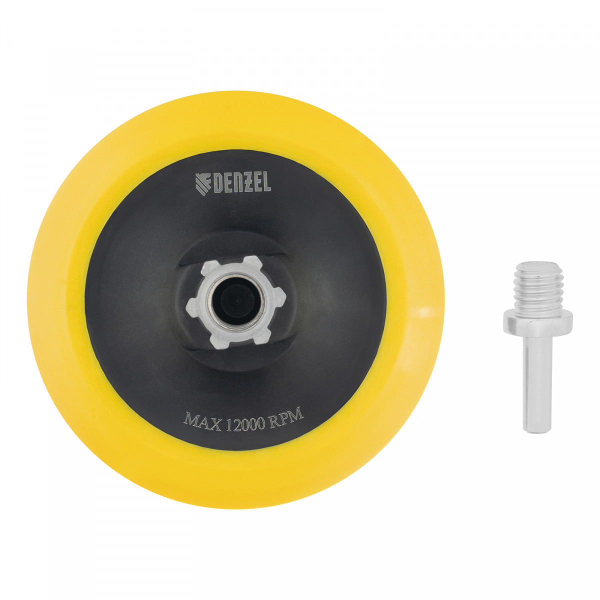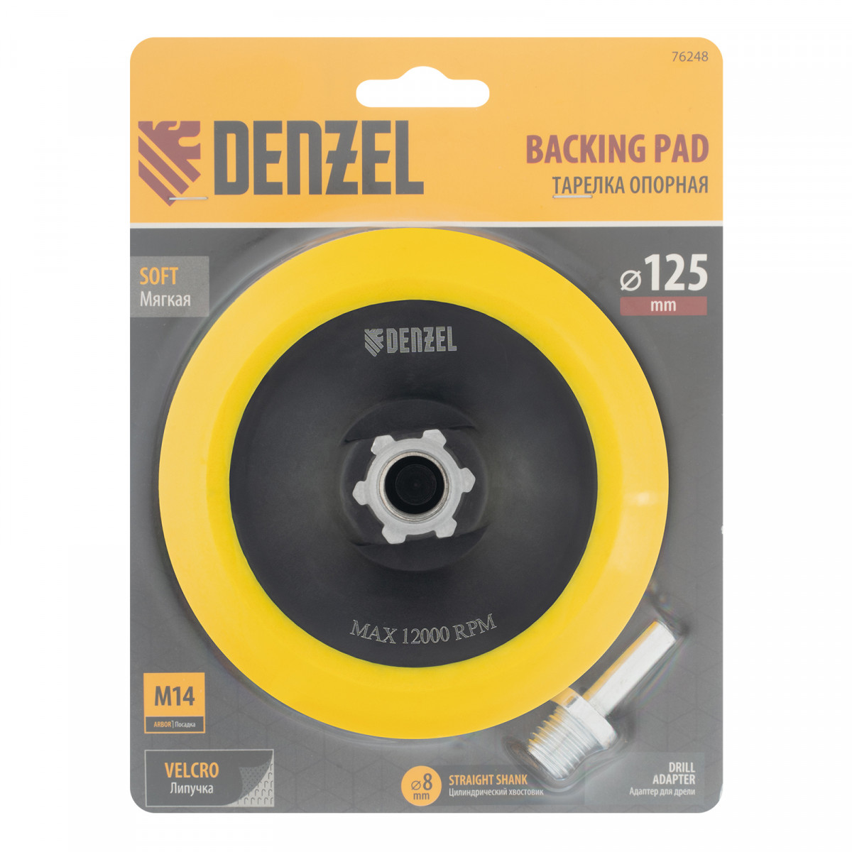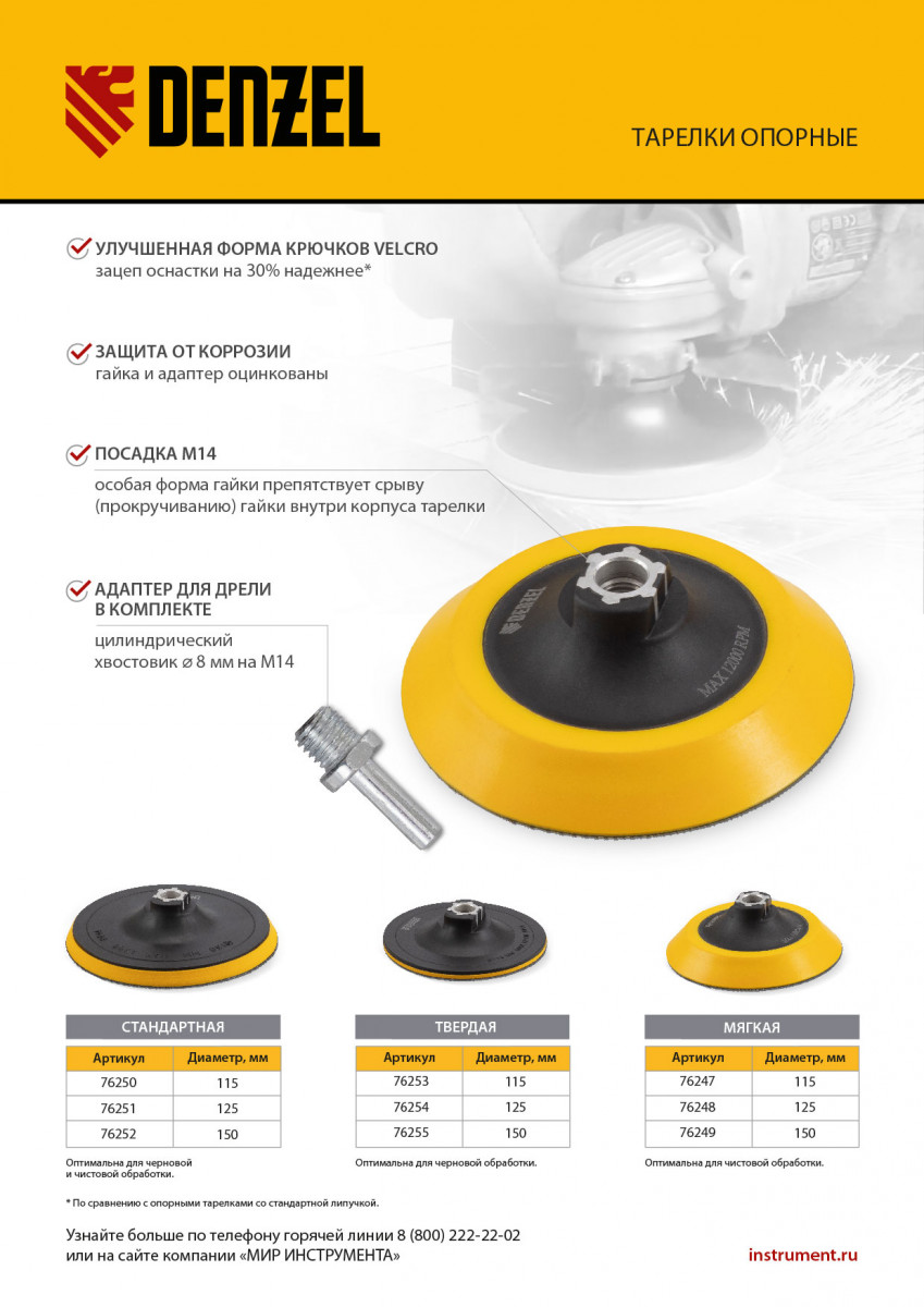 Тарелка опорная для дрели и УШМ с липучкой, 125 мм, мягкая, с адаптером c М14 на d8 Denzel