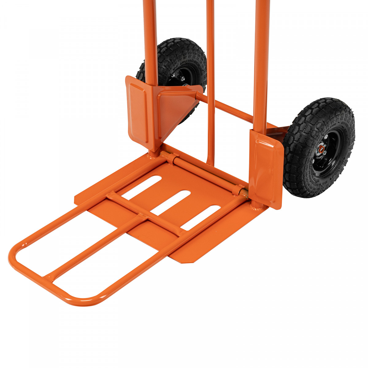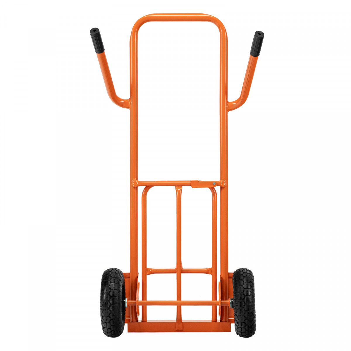 - Удобная транспортировка груза — пневматические колеса с камерами, резиновыми шинами и 2 шарикоподшипниками в каждом гасят вибрации и обеспечивают плавность хода.