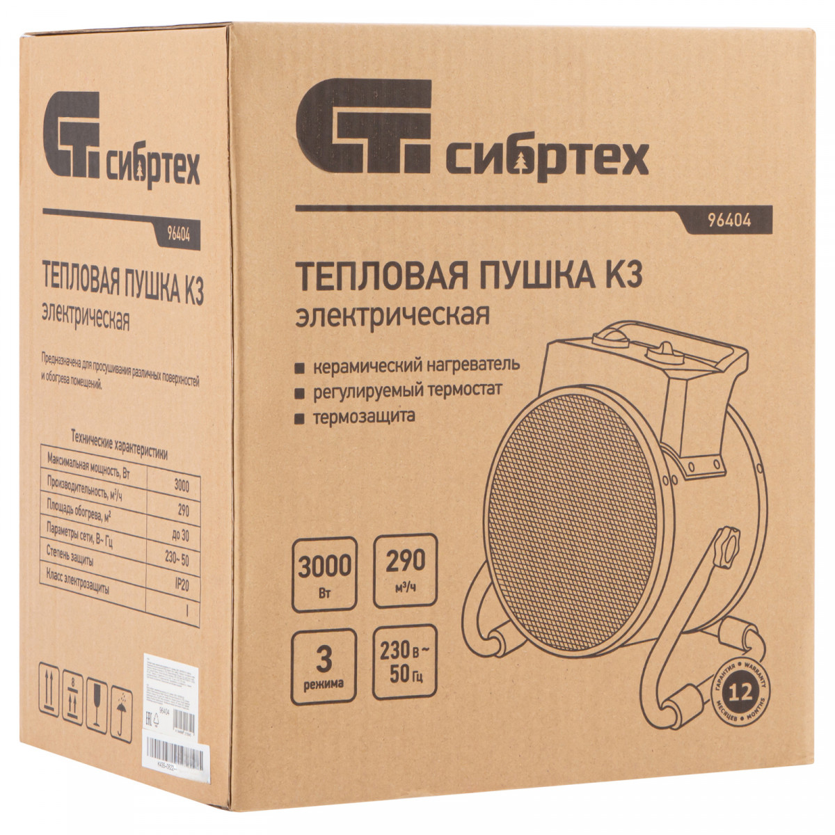 Тепловая пушка Сибртех К3 96404 с керамическим нагревательным элементом работает от сети 230 В и имеет три режима: вентиляция без нагрева, нагрев с мощностью 1500 или 3000 Вт. Предназначена для обогрева или вентиляции нежилых помещений площадью до 30 кв. м, просушки различных поверхностей, например, бетонных стяжек, окрашенных или оштукатуренных стен.,Отличительная черта пушки — технология PTC. Металлокерамические нагревательные элементы обладают функцией саморегуляции электрического сопротивления, что обеспечивает оптимальную температуру нагревательного элемента и пожаро-, взрывобезопасность изделия. При сохранении физической целостности нагревательный элемент не теряет своих свойств на протяжении всего срока службы.
