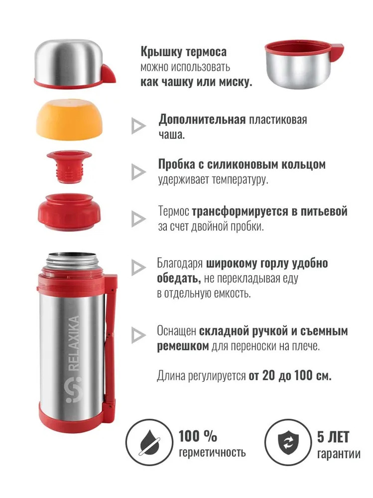 Универсальный термос для еды и напитков Relaxika 201 1.8 литра, стальной R201.1800.1 относится к классической серии. Простой в использовании, экономичный и многофункциональный. Его можно применять как для хранения еды, так и для хранения напитков.