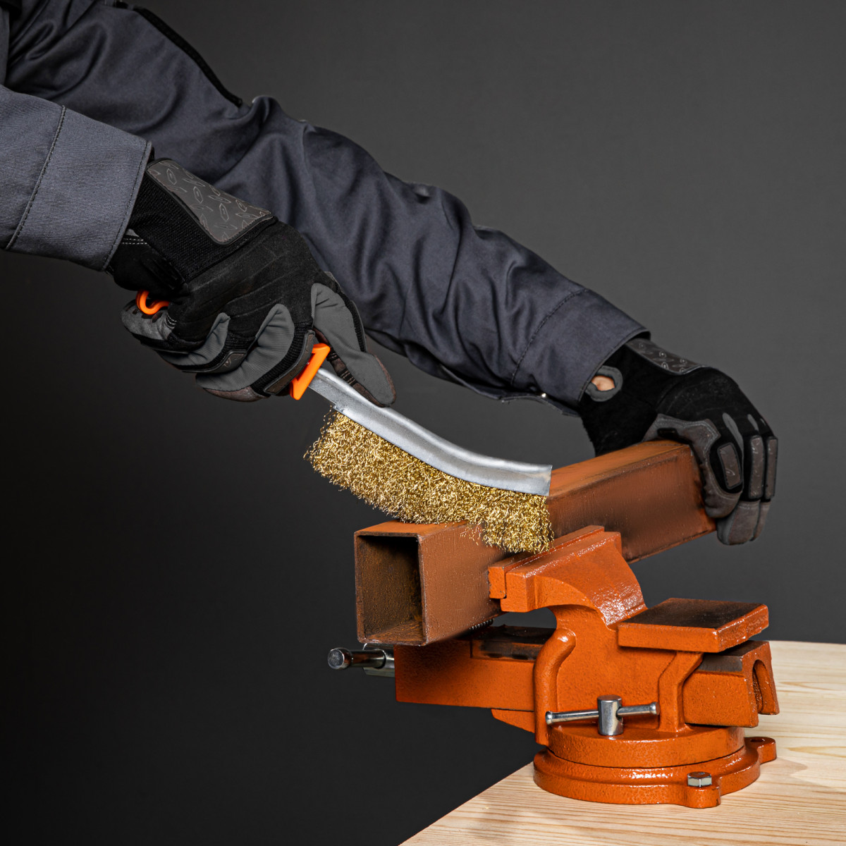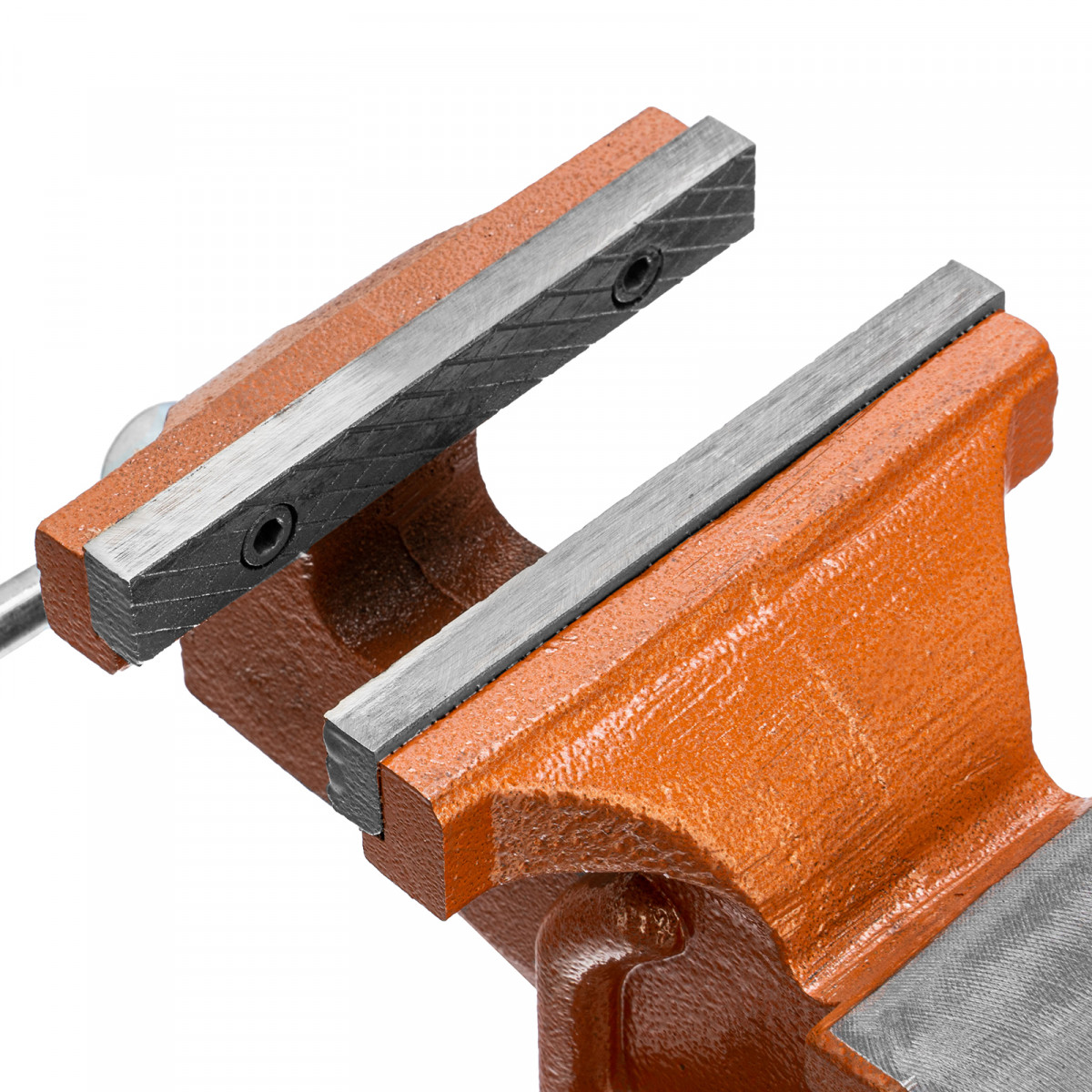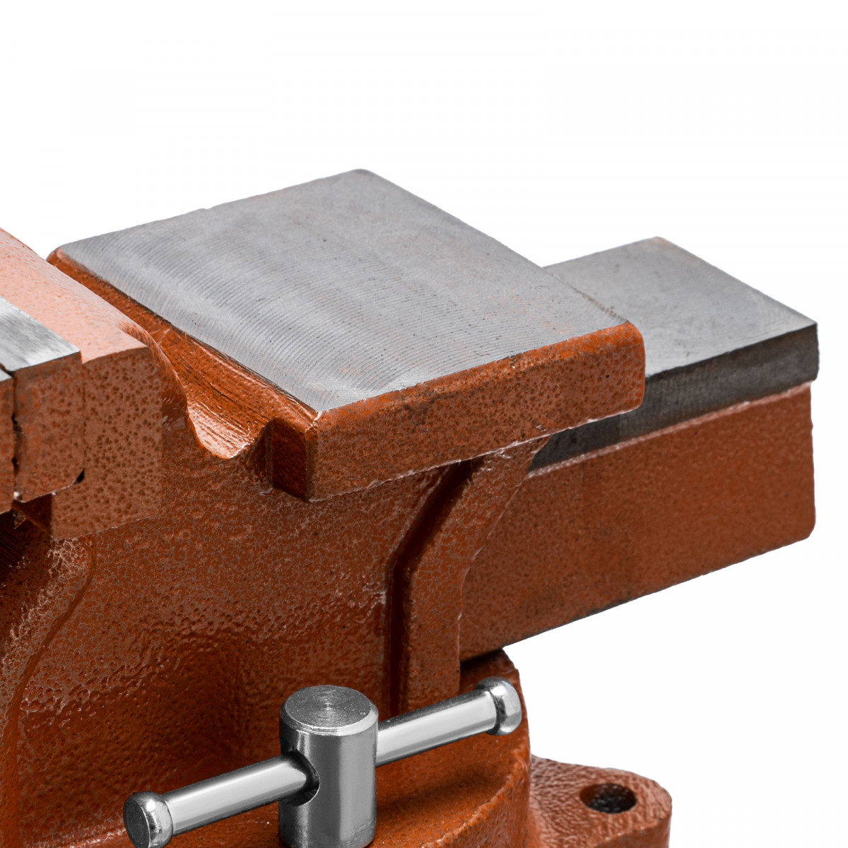 - Корпус тисков выполнен из чугуна, а губки — из стали, благодаря чему достигается высокая прочность инструмента.