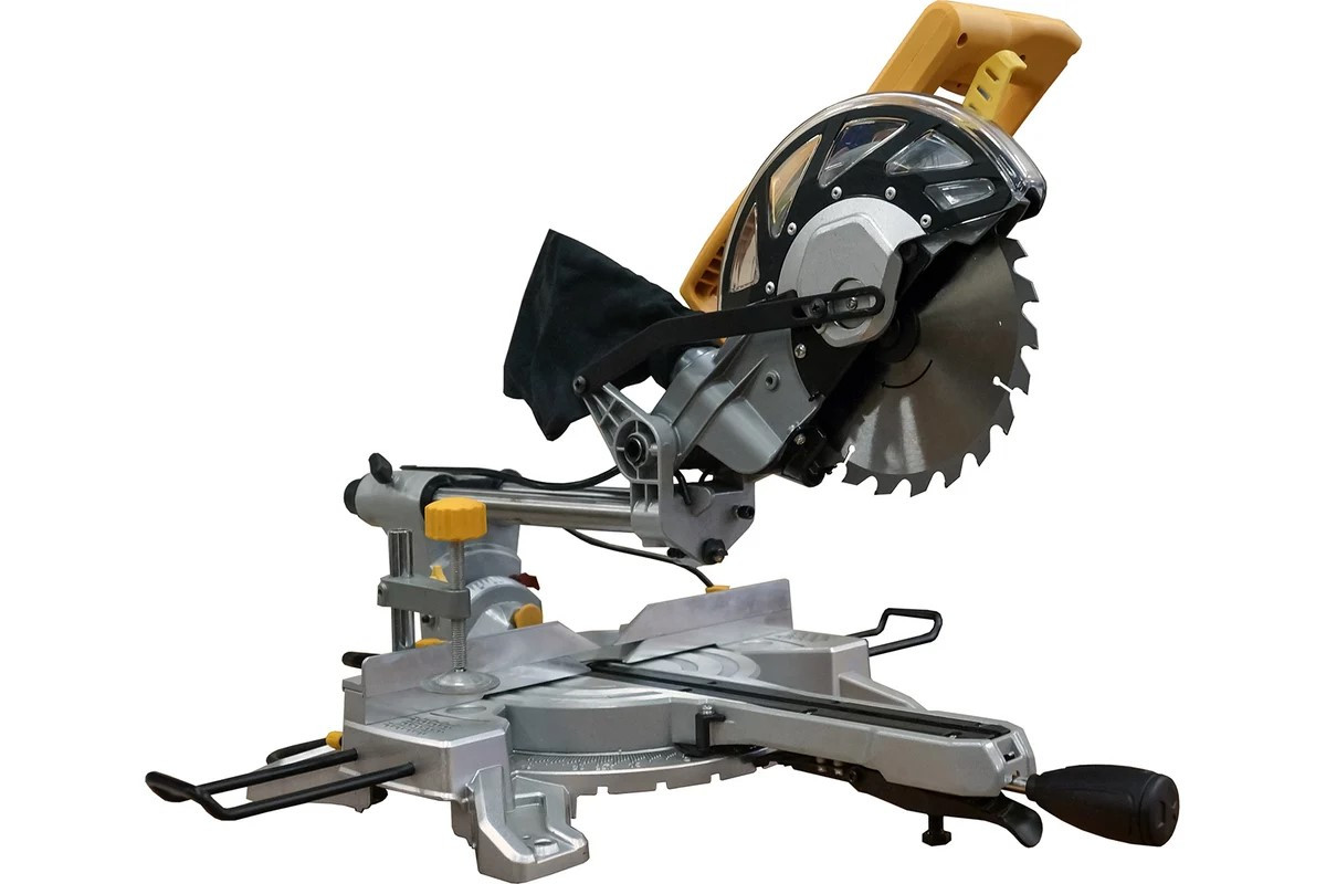 Пильный диск защищен кожухом, что обеспечивает безопасность в процессе работы.