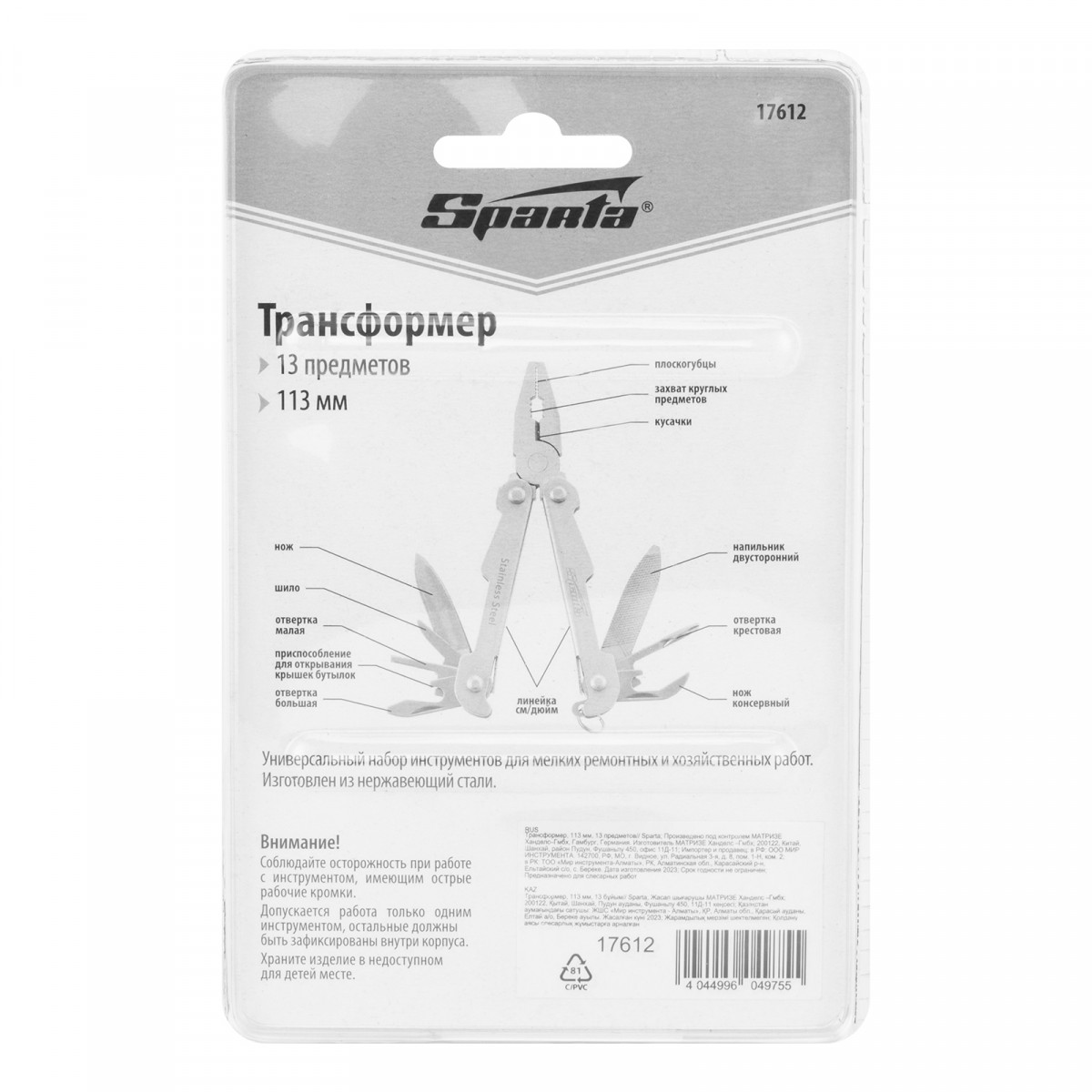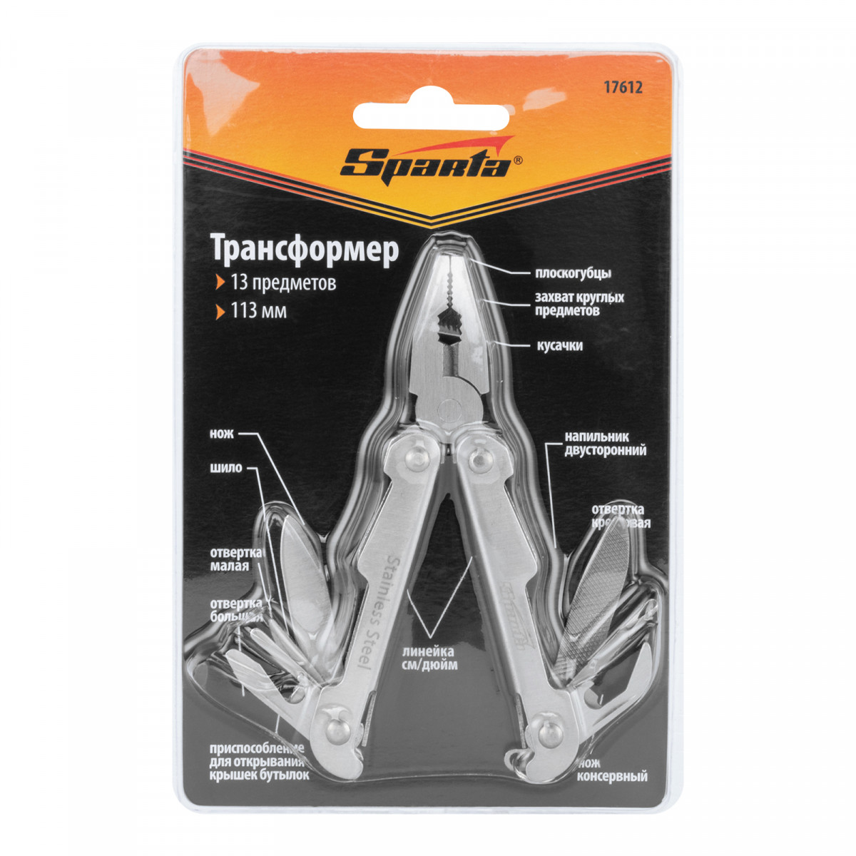 Трансформер Sparta 17612 длиной 113 мм имеет 13 функций и объединяет в себе слесарные и бытовые инструменты. Пригодится дома, на даче, в походе или поездке, на рыбалке и охоте, также будет полезен в гараже. Компактный трансформер легко поместится в карман, сумку или рюкзак.