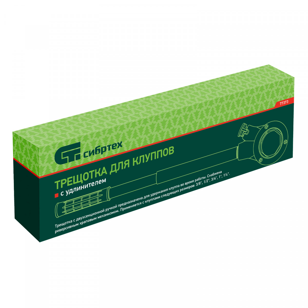 Трещотка для клуппов с удлинителем Сибртех 77373 удерживает клупп во время нарезания трубной резьбы. Удлиненная ручка позволяет увеличить крутящий момент, не прилагая значительных усилий. Трещотка используется для монтажа трубопроводов и решения бытовых задач.