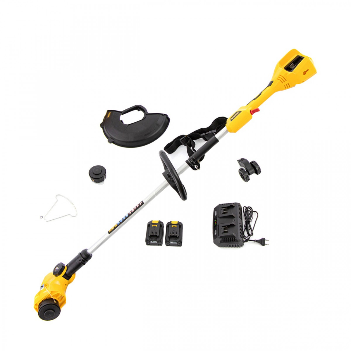 Триммер - 1 штДополнительная рукоятка - 1 штКомплект крепежа - 1 штКожух защитный - 1 штОграничительный ролик - 1 штЗащитная скоба - 1 штРемень плечевой - 1 штАккумуляторная батарея Li-ion 18 В, 4 Ач - 2 штЗарядное устройство на 2 аккумуляторные батареи - 1 штРуководство по эксплуатации с гарантийным талоном - 1 штПлечевой ремень - 1 шт