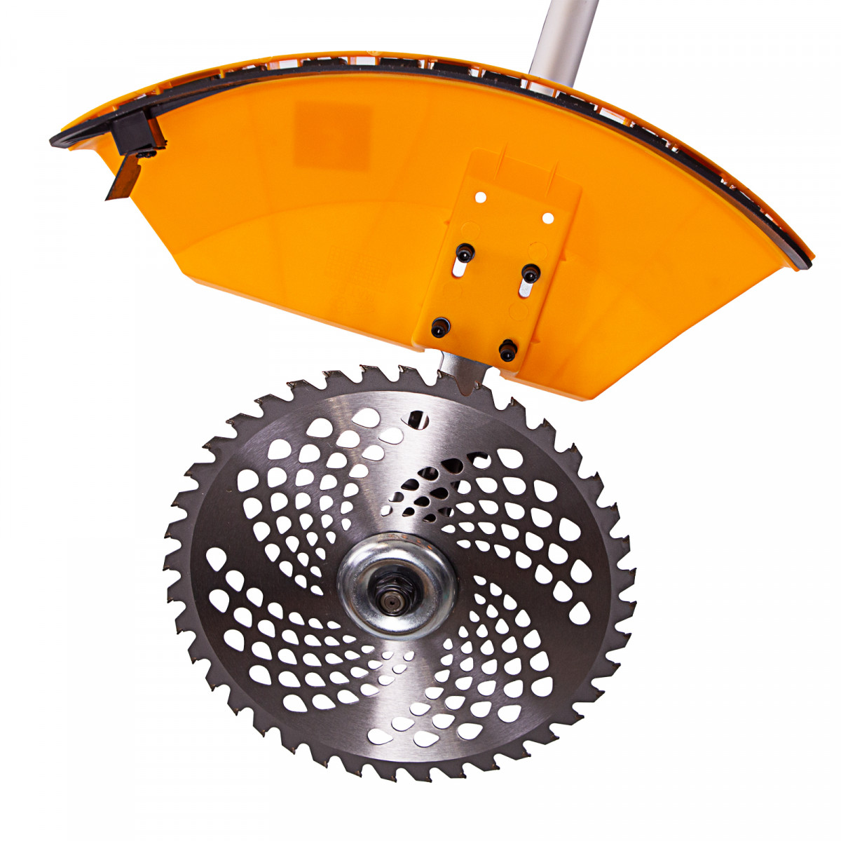 - Безопасность — пластиковый кожух защищает пользователя от вылетающих твердых частиц, травы и камней.