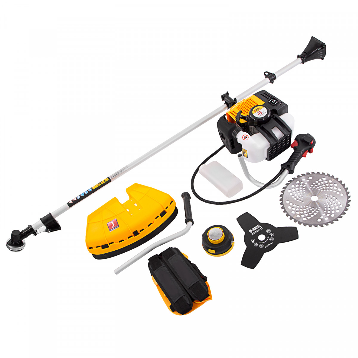 Триммер бензиновый - 1 штКатушка - 1 штНож трехлопастной 3Т - 1 штПильный диск 40Т - 1 штДвухплечевая подвесная система с защитой бедра - 1 штДозатор для приготовления смеси - 1 штНабор крепежа - 1 штНабор инструментов - 1 штРуководство по эксплуатации с гарантийным талоном - 1 штДозатор для приготовления топливной смеси - 1 шт