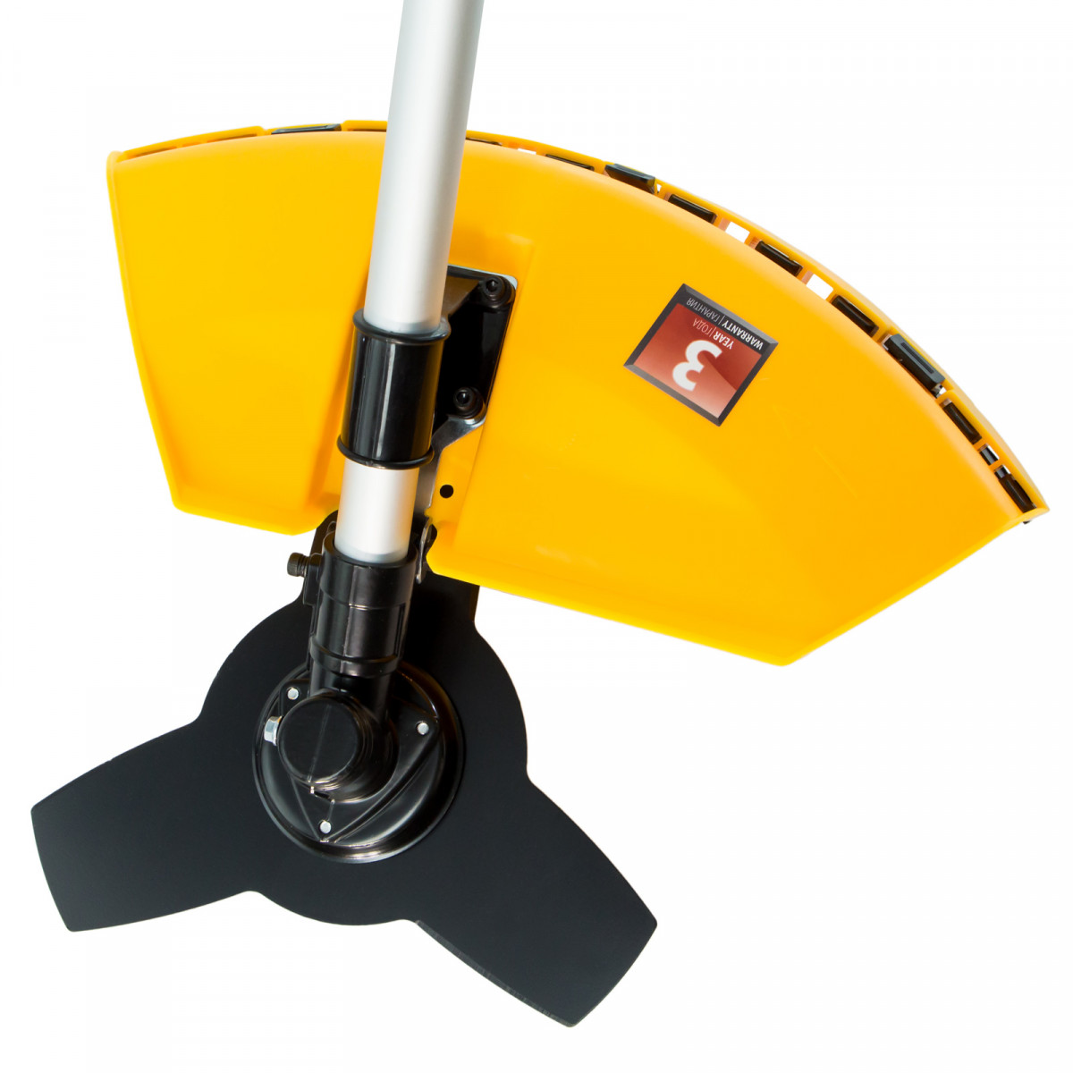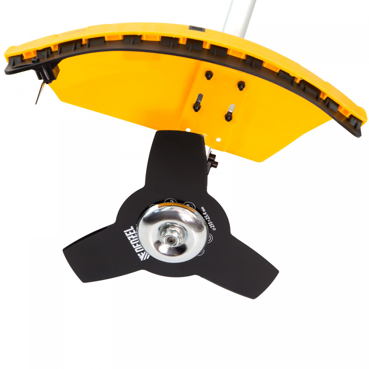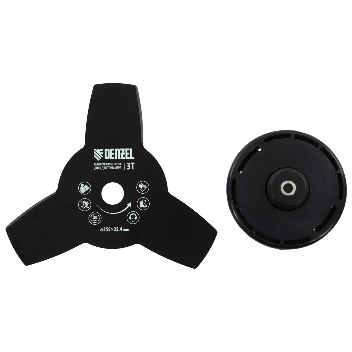 - Дополнительные возможности — можно приобрести диск Denzel 96323 с шириной скашивания 230 мм для быстрого удаления растительности с жесткими стеблями, 96328 для скашивания молодых побегов кустарника диаметром до 3 мм, 96340 для срезания борщевика, кустарника и молодых побегов деревьев с диаметром стволов до 10 мм.
