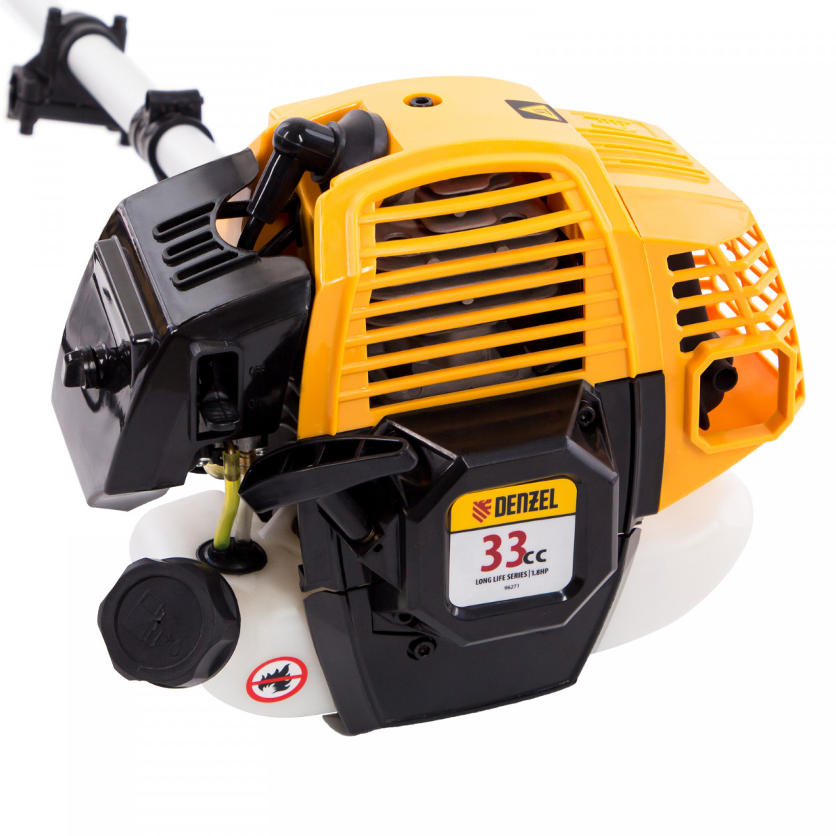 Бензиновый триммер Denzel DR-33 96271 с двигателем объемом 33 см3 и неразъемной штангой состоит из 2 частей. Используется для ухода за газоном, скашивания травы различных типов, в том числе с жесткими стеблями (полыни, крапивы, лебеды). Режущими элементами являются трехлопастный стальной нож и усиленная полиамидная катушка с леской. Оснастка вращается со скоростью 9500 об/мин и обеспечивает ширину скашивания 25,5 см и 42 см. Двухтактный одноцилиндровый двигатель не зависит от электросети, поэтому триммер может использоваться на отдаленных участках. Топливная смесь готовится из бензина и масла, для смешивания которой предусмотрен удобный дозатор.