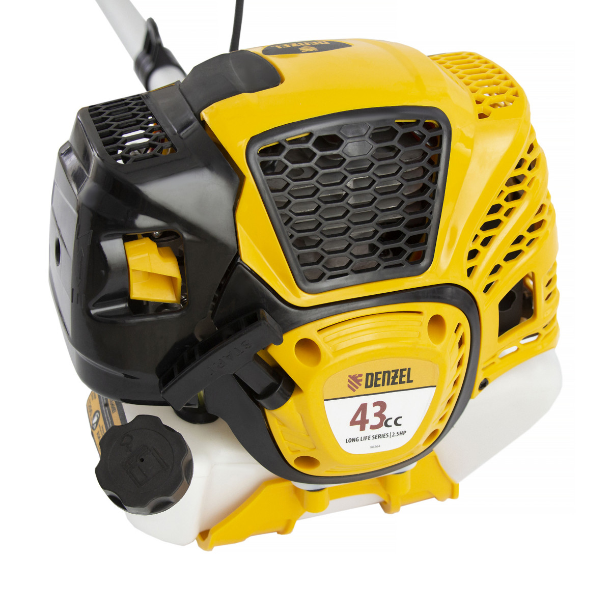 Бензиновый триммер Denzel DTL-43S 96264 с разъемной штангой, состоящей из 2 частей, оснащен 2-тактным двигателем объемом 43 см3 и предназначен для стрижки газона, скашивания травы всех типов, в том числе с жесткими древовидными стеблями (полыни, крапивы, лебеды, борщевика), а также срезания кустарника и молодых побегов деревьев с диаметром стволов до 10 мм. Усиленная катушка с леской и пильный диск, вращающиеся со скоростью 9500 об/мин, обеспечивают ширину скашивания 42 и 25,5 см. Инструмент не требует подключения к электросети, поэтому подходит для работы с влажной травой и может использоваться на отдаленных от дома участках.