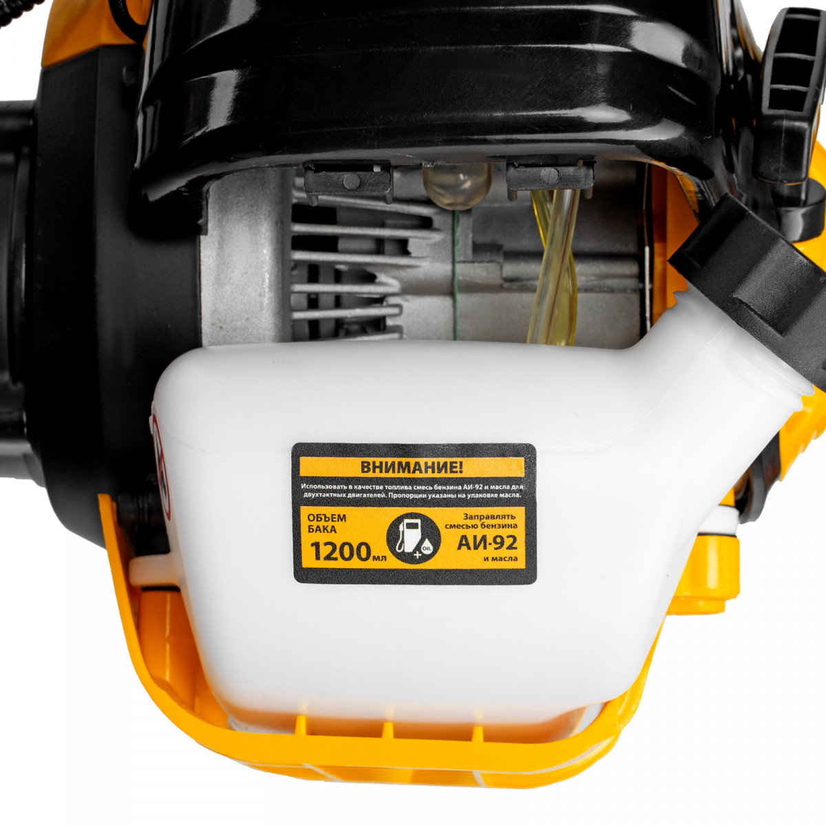 - Удобное приготовление топливной смеси — бензин и смазочное масло смешиваются в дозаторе (входит в комплект) и заливаются в бак.
