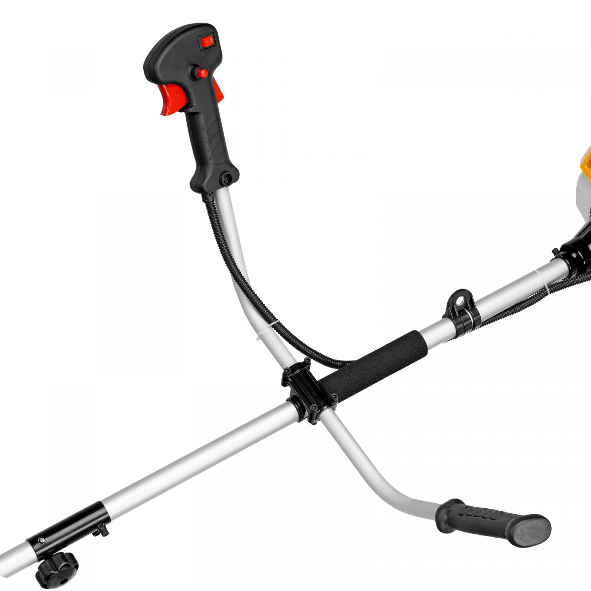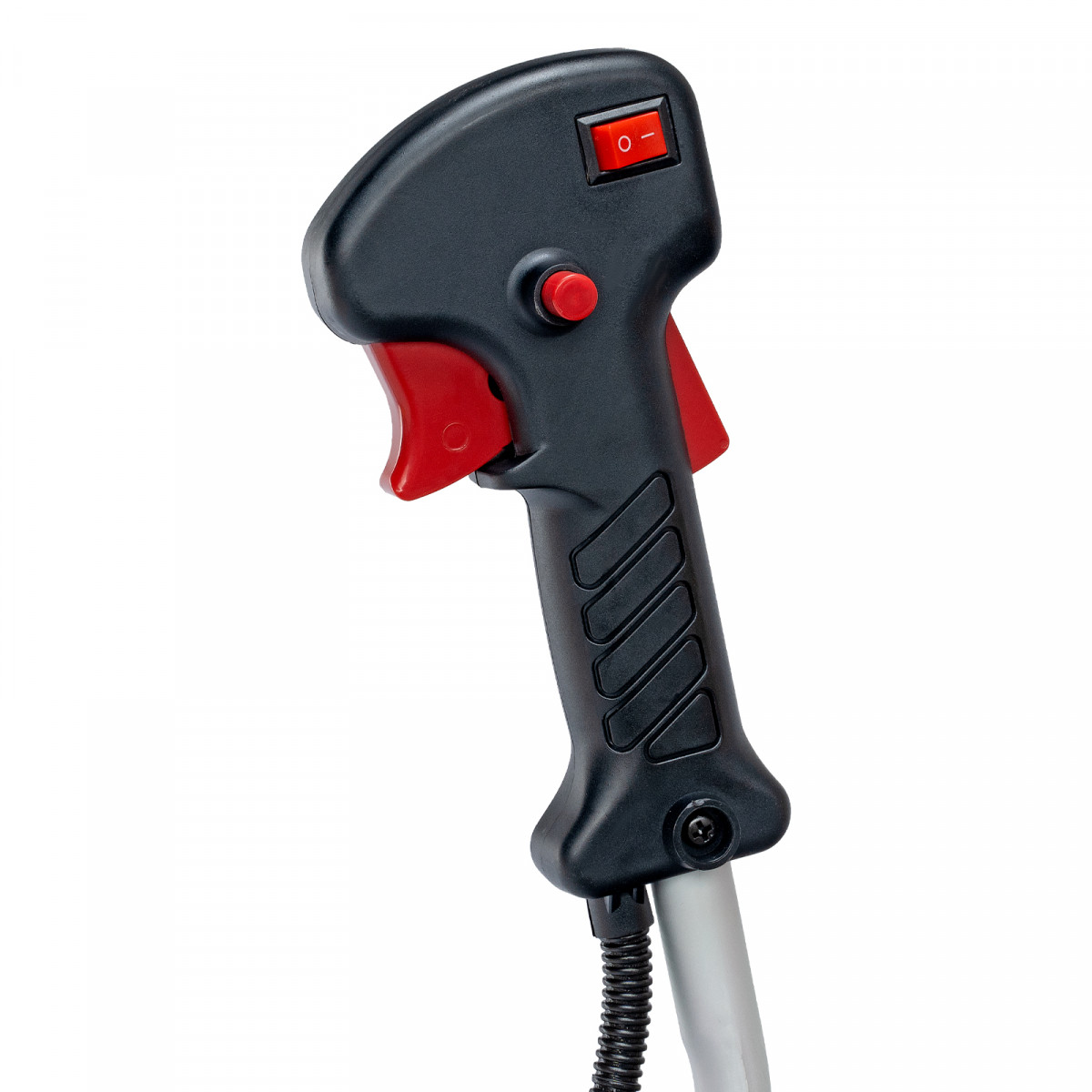 - Эргономичность — велосипедная рукоятка имеет асимметричную форму, поэтому триммер удобно удерживать и направлять.