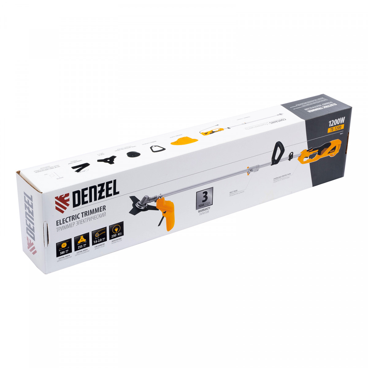 Триммер Denzel TE-1200 96611 мощностью 1200 Вт, с разборной штангой, комплектуется катушкой с леской и 3-лопастным диском, ширина скашивания составляет 380 мм и 255 мм соответственно. Идеален для скашивания травы различных типов, в том числе с жесткими стеблями (полыни, крапивы, лебеды). Благодаря верхнему расположению двигателя может косить мокрую траву.,Двигатель мощностью 1200 Вт обеспечивает вращение оснастки с частотой 7000 об/мин. поэтому уход за участком не займет много времени. Электротриммер прост в обращении — ему не требуется сложное техническое обслуживание, пользоваться им сможет даже новичок.