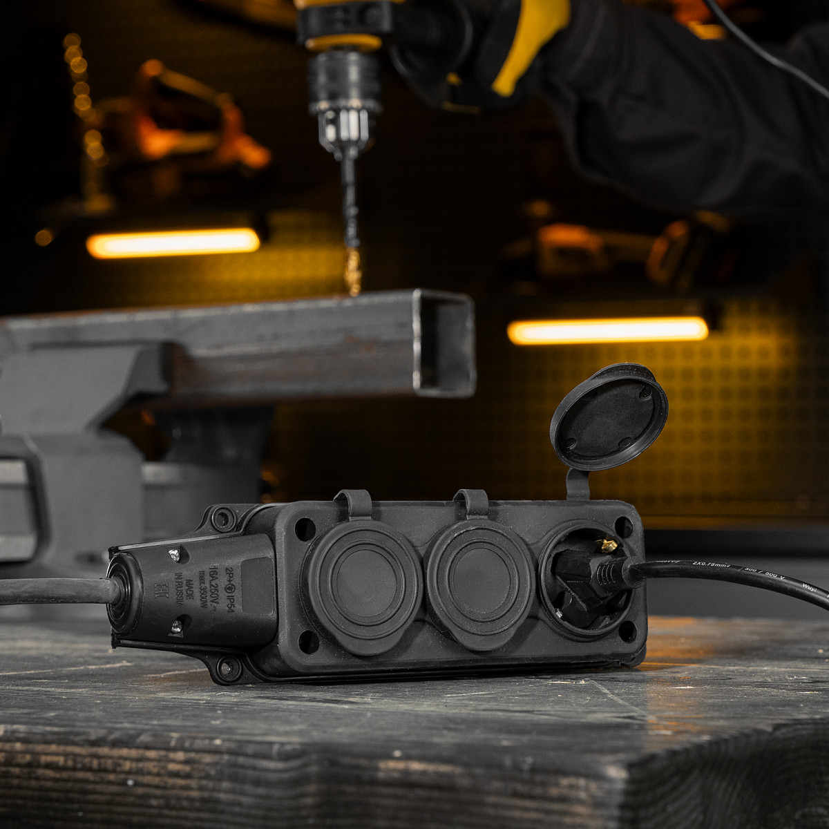 • Высокая степень защиты — удлинитель можно использовать даже во время выпадения осадков.