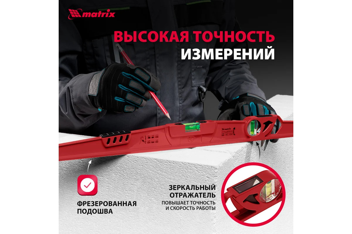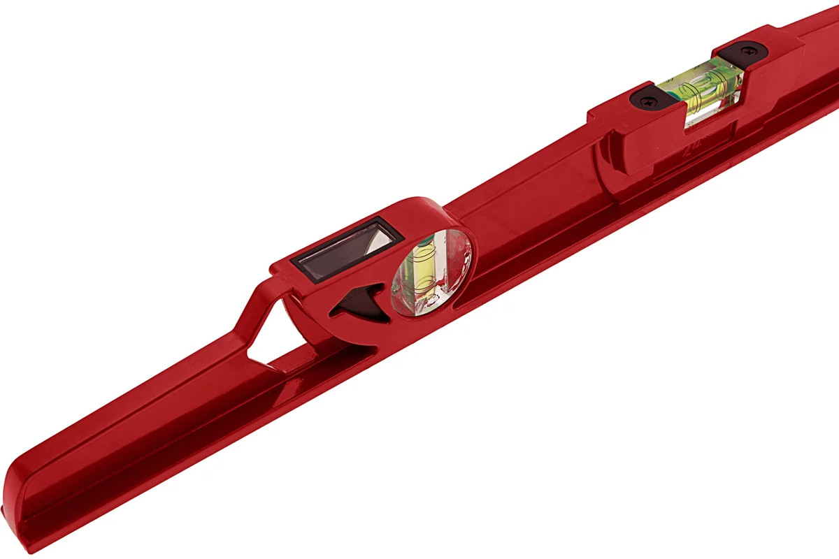 Алюминиевый уровень 600 мм, литой, 2 глазка , ударная площадка MATRIX 34907 обладает высокой прочностью. Наличие ударной площадки для выравнивания кирпича или блоков при укладке существенно упрощает работу кладочника. Для точности измерений имеются насечки возле каждого глазка и отражатели.