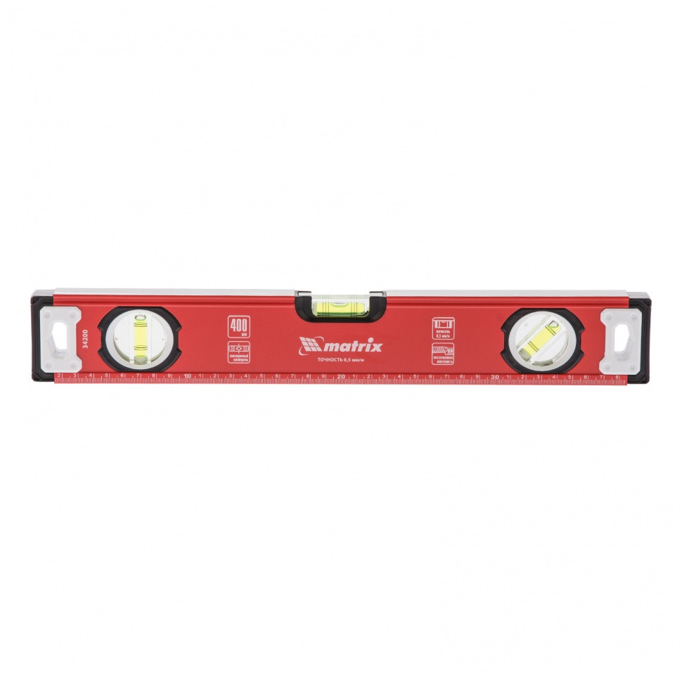 Уровень алюминиевый фрезерованный Matrix 34200 длиной 400 мм, с 3 глазками, предназначен для определения отклонений от горизонтальной и вертикальной поверхностей и угла 45°. Обеспечивает высокую точность полученных результатов, пригодится для выполнения строительных и отделочных работ.
